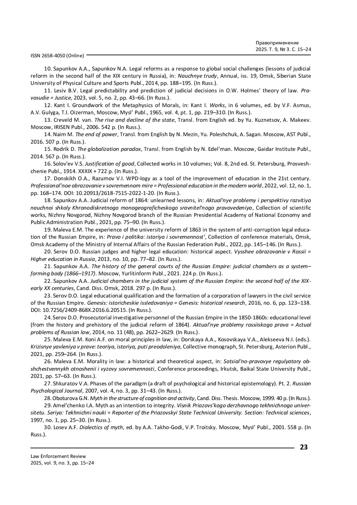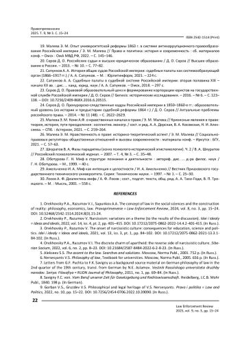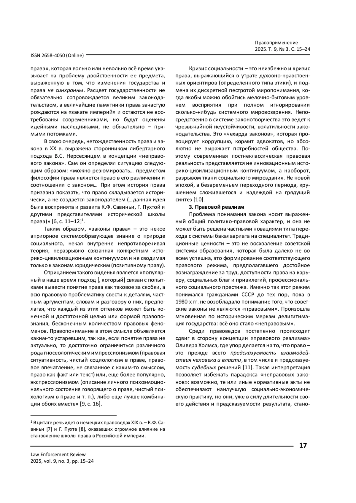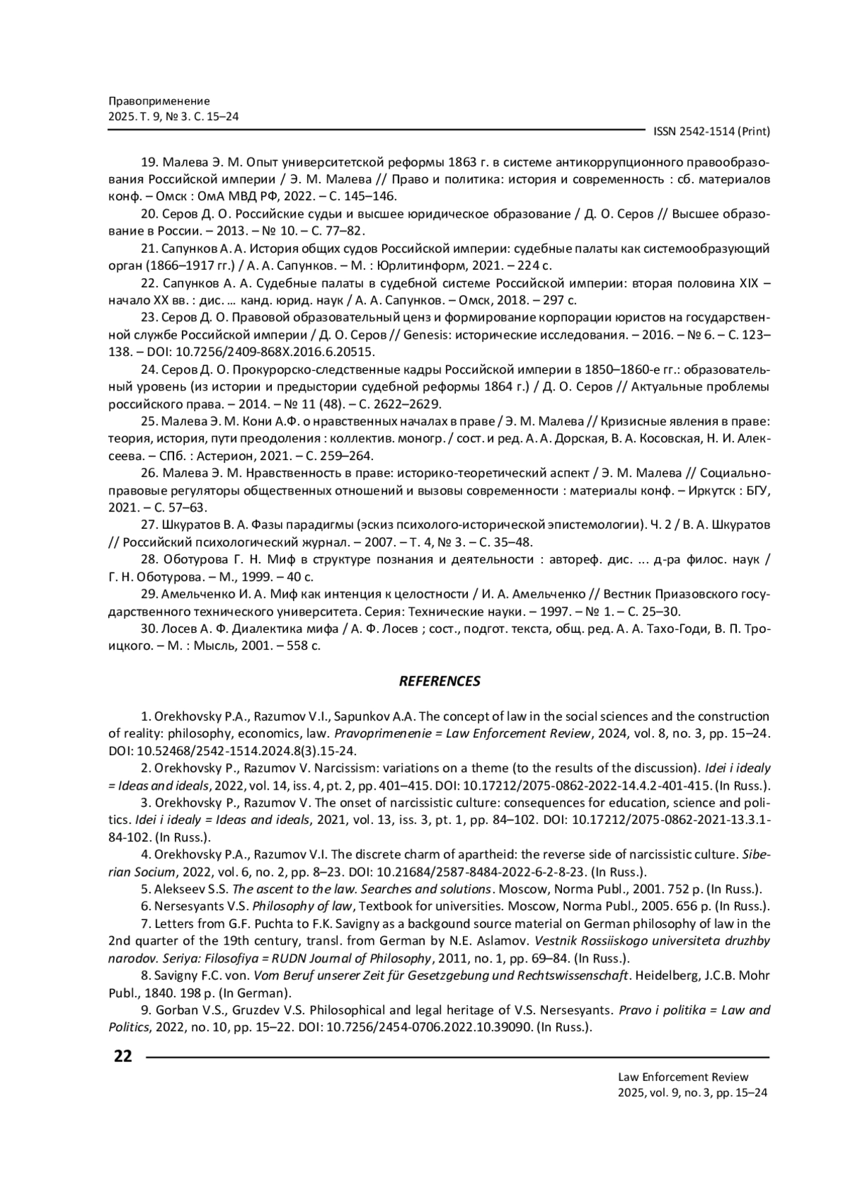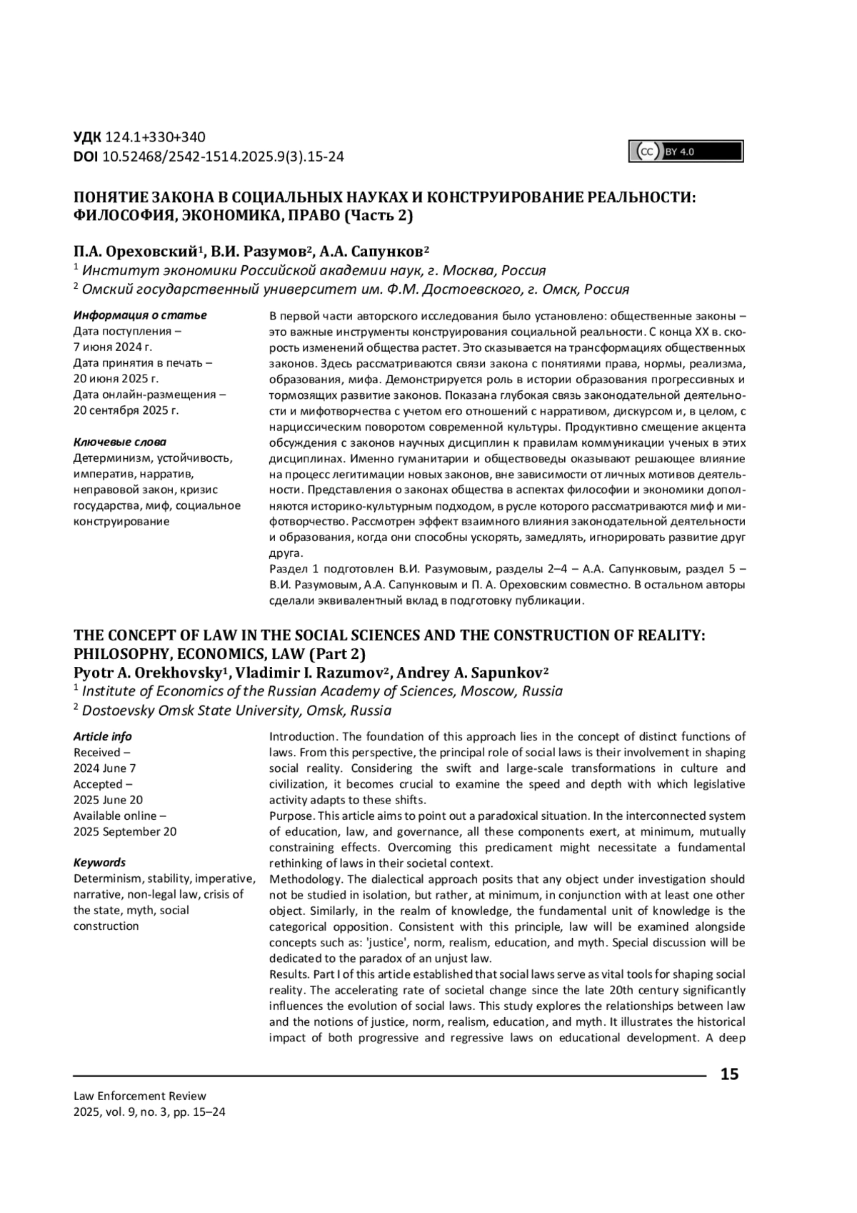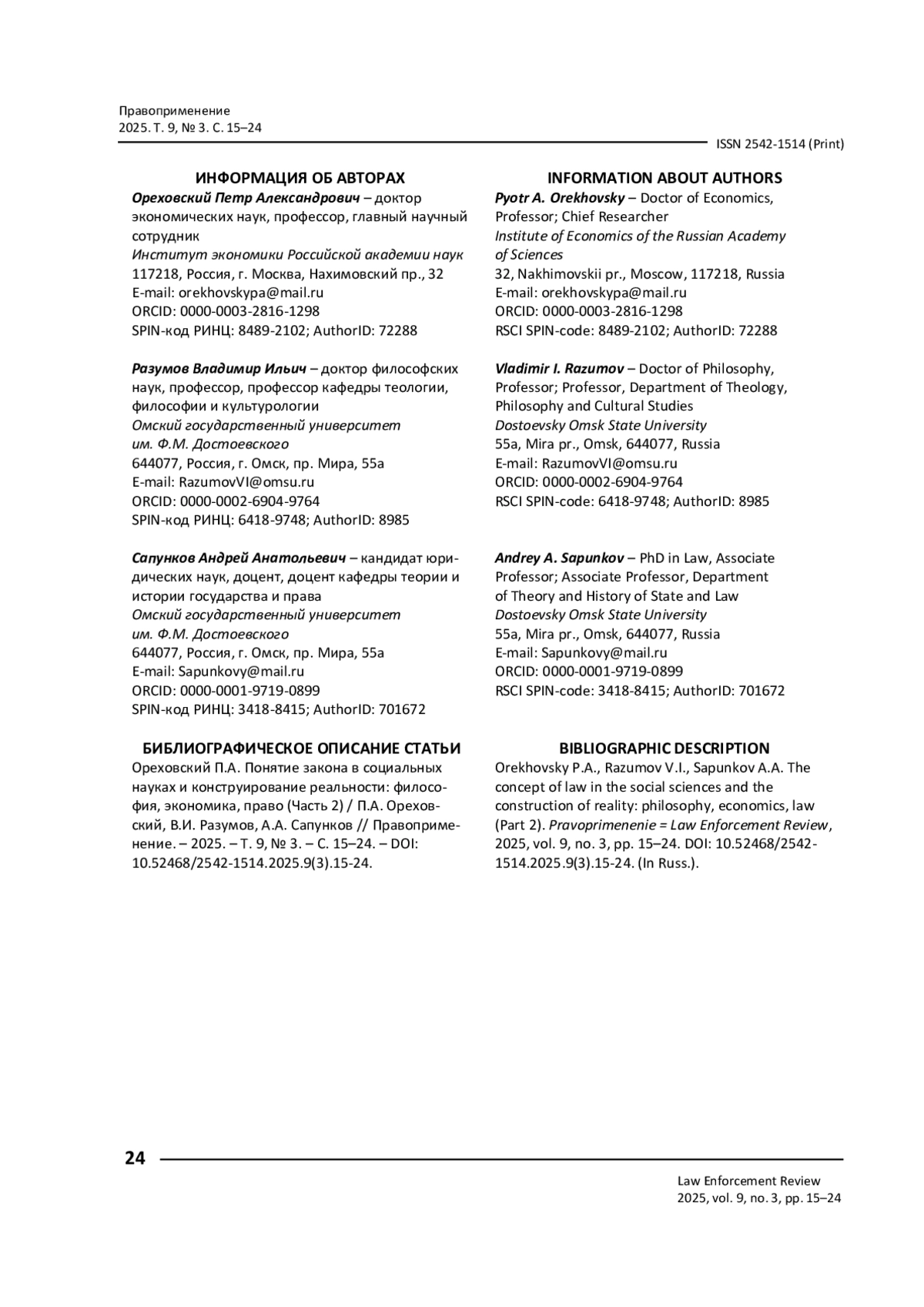 РАЗУМОВ В. И., ОРЕХОВСКИЙ П. А., САПУНКОВ А. А. ПОНЯТИЕ ЗАКОНА В СОЦИАЛЬНЫХ НАУКАХ И КОНСТРУИРОВАНИЕ РЕАЛЬНОСТИ: ФИЛОСОФИЯ, ЭКОНОМИКА, ПРАВО (ЧАСТЬ 2) // ПРАВОПРИМЕНЕНИЕ. 2025. ТОМ 9, № 3