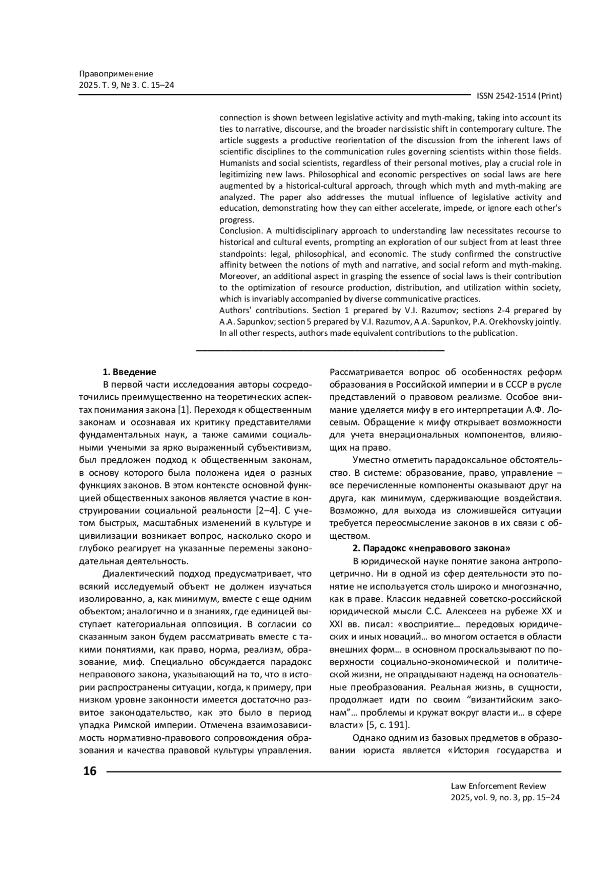 В первой части авторского исследования было установлено: общественные законы – это важные инструменты конструирования социальной реальности. С конца XX в. скорость изменений общества растет. Это сказывается на трансформациях общественных законов. Здесь рассматриваются связи закона с понятиями права, нормы, реализма, образования, мифа. Демонстрируется роль в истории образования прогрессивных и тормозящих развитие законов. Показана глубокая связь законодательной деятельности и мифотворчества с учетом его отношений с нарративом, дискурсом и, в целом, с нарциссическим поворотом современной культуры. Продуктивно смещение акцента обсуждения с законов научных дисциплин к правилам коммуникации ученых в этих дисциплинах. Именно гуманитарии и обществоведы оказывают решающее влияние на процесс легитимации новых законов, вне зависимости от личных мотивов деятельности. Представления о законах общества в аспектах философии и экономики дополняются историко-культурным подходом, в русле которого рассматриваются миф и мифотворчество. Рассмотрен эффект взаимного влияния законодательной деятельности и образования, когда они способны ускорять, замедлять, игнорировать развитие друг друга. Раздел 1 подготовлен В. И. Разумовым, разделы 2–4 – А. А. Сапунковым, раздел 5 –В. И. Разумовым, А. А. Сапунковым и П. А. Ореховским совместно. В остальном авторы сделали эквивалентный вклад в подготовку публикации.