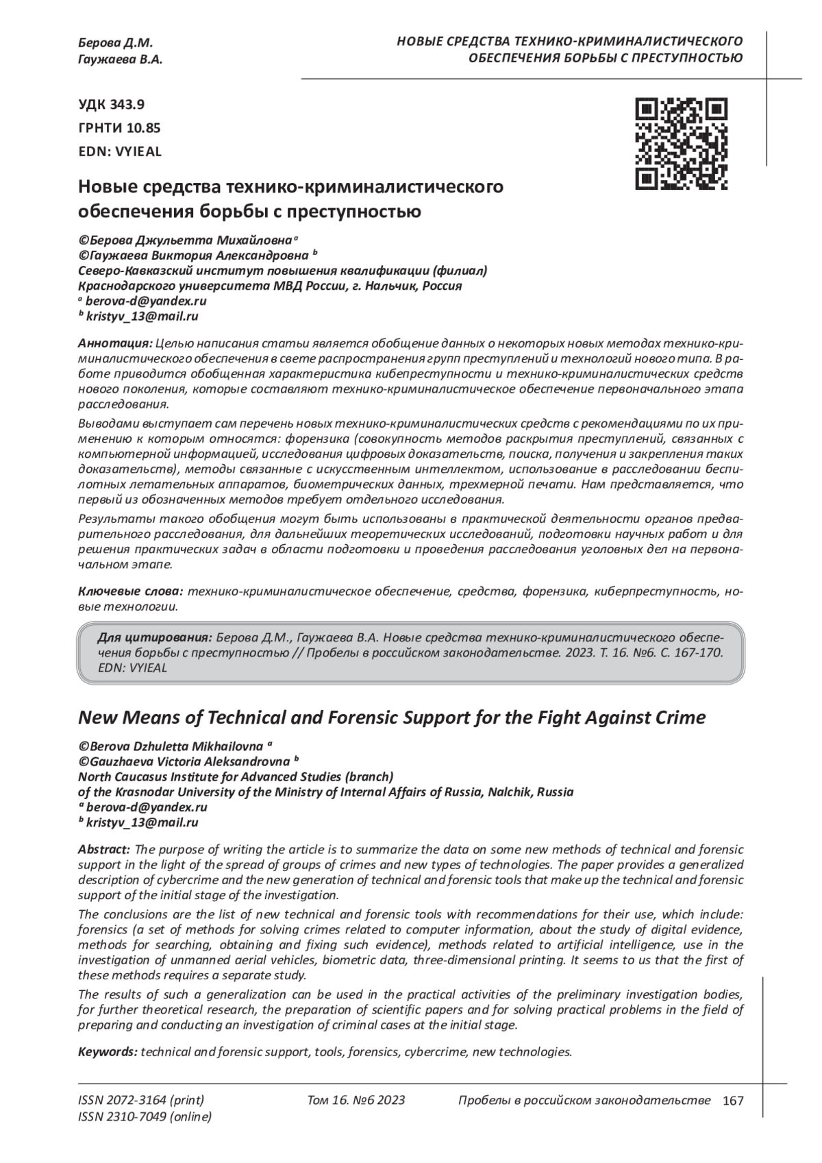 Gauzhaeva V.A., Lifanova L.G. Biometric identification in criminalistics // Agrarian and land law. 2023. No. 3 (219). pp. 151-154. EDN: XHLUNY