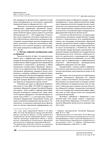 Цифровая трансформация конституционного права на обращение началась с либерального подхода (были установлены упрощенные требования к обращениям в электронной форме) и до 2025 г. характеризовалась увеличением числа электронных каналов подачи обращений граждан. Однако с 30 марта 2025 г. тенденция сменилась. Были упорядочены электронные способы подачи обращений, а их отправка была обусловлена идентификацией и (или) аутентификацией заявителей. В статье анализируются следующие этапы трансформации конституционного права на обращение: легализация обращений в электронной форме, появление специализированных государственных порталов для подачи обращений, появление исключительно электронных форм обращений граждан, использование Единого портала государственных и муниципальных услуг для подачи обращений, а также новеллы конца 2024 г., упорядочившие способы подачи электронных обращений.