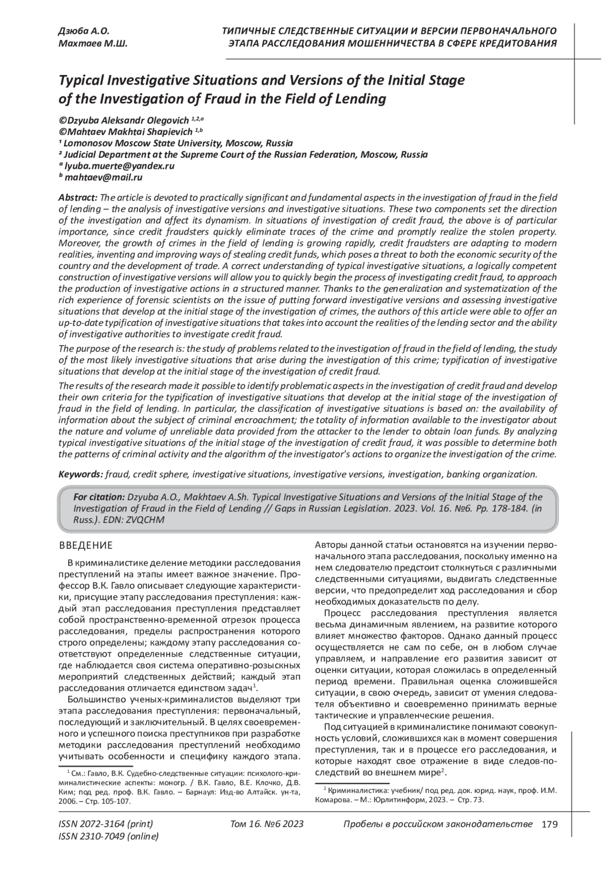 Tagirov R. A. Investigative versions on cases of fraud investigation in the sphere of crediting of legal entities and individual entrepreneurs // A Russian investigator. - 2021. - No. 9. - p. 27.