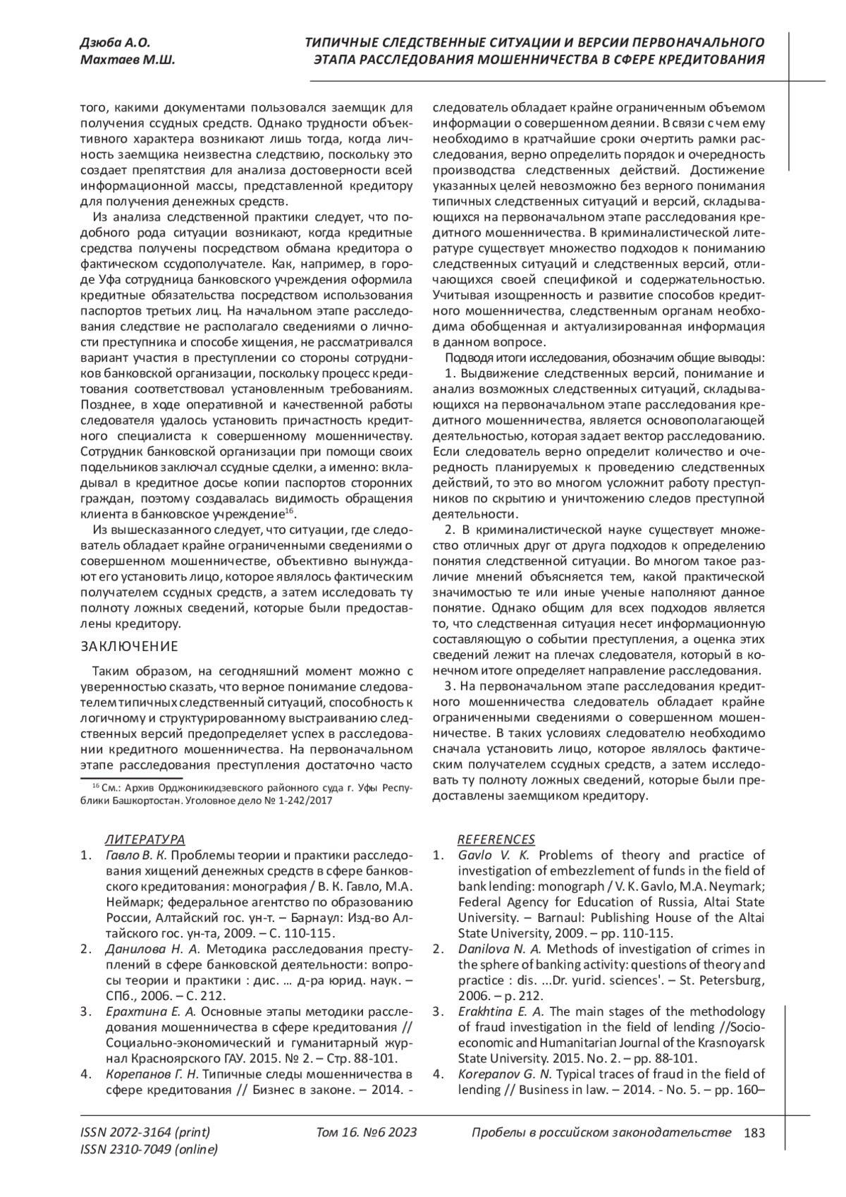 7. Тагиров Р. А. Следственные версии по делам о расследовании мошенничества в сфере кредитования юридических лиц и индивидуальных предпринимателей // Российский следователь. - 2021. - № 9. - С. 27. EDN: XBMMEB