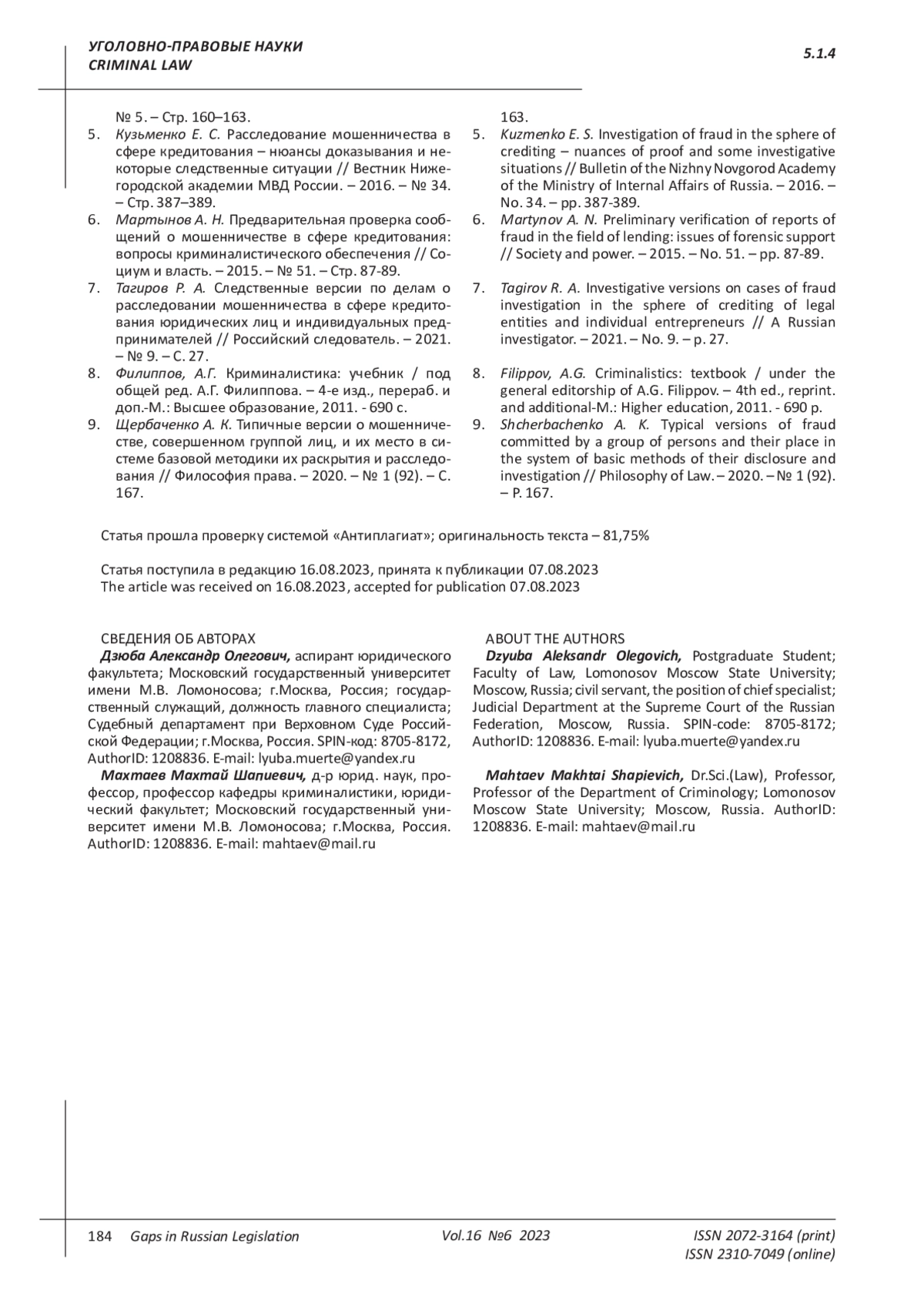 9. Щербаченко А. К. Типичные версии о мошенничестве, совершенном группой лиц, и их место в системе базовой методики их раскрытия и расследования // Философия права. - 2020. - № 1 (92). - С. 167. EDN: MOSWII