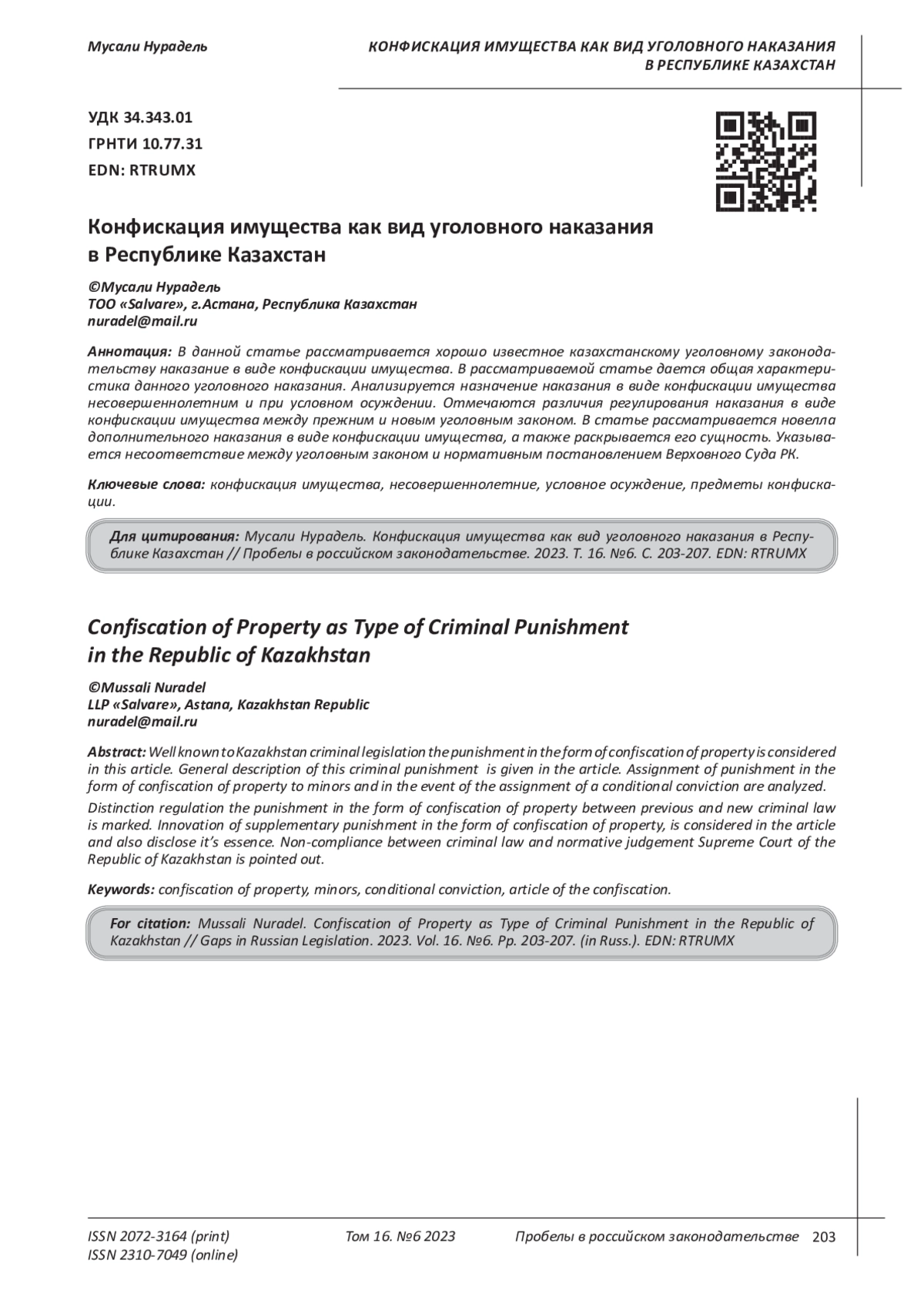 В данной статье рассматривается хорошо известное казахстанскому уголовному законодательству наказание в виде конфискации имущества. В рассматриваемой статье дается общая характеристика данного уголовного наказания. Анализируется назначение наказания в виде конфискации имущества несовершеннолетним и при условном осуждении. Отмечаются различия регулирования наказания в виде конфискации имущества между прежним и новым уголовным законом. В статье рассматривается новелла дополнительного наказания в виде конфискации имущества, а также раскрывается его сущность. Указывается несоответствие между уголовным законом и нормативным постановлением Верховного Суда РК.