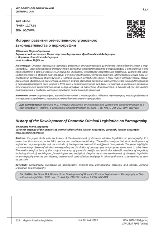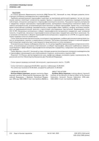 Torosyan R.V. Criminal liability for the illegal production and distribution of pornographic objects in Russian criminal law: historical continuity and evolution // A Russian investigator. 2009. № 24. P. 23-24.