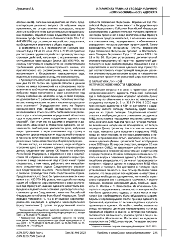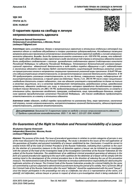 Цель исследования. Вопрос о процессуальных гарантиях в отношении отдельных категорий лиц является одним из наиболее обсуждаемых в теории уголовного судопроизводства. Исследование посвящено вопросам реального применения установленных законодательством гарантий свободы и личной неприкосновенности адвоката. Выводы: Было бы правильным внести изменения в ст. 450 УПК РФ, указав, что ходатайство перед судом об избрании меры пресечения в виде заключения под стражу в отношении адвоката может быть возбуждено следователем с согласия руководителя следственного органа Следственного комитета Российской Федерации по субъекту Российской Федерации. Установление дополнительной уголовно-процессуальной гарантии адвокатской деятельности в виде особого порядка обращения в суд с ходатайством о заключении адвоката под стражу будет соответствовать существующей тенденции развития уголовно-процессуального закона в направлении сокращения применения указанной меры пресечения. В КоАП РФ ввести административную ответственность за воспрепятствование законной деятельности адвоката. В УК РФ предусмотреть уголовную ответственность за то же деяние, совершенное лицом, подвергнутым административному наказанию, в период срока его действия. Часть 2 ст. 296 УК РФ после слова «защитника» необходимо дополнить словом «адвоката», так как адвокат участвует в производстве по делам не только в качестве защитника, но и в качестве представителя потерпевшего, гражданского истца, гражданского ответчика, адвоката свидетеля или лица, в отношении которого проводится доследственная проверка. Следует также дополнить ст.298.1 УК РФ, предусматривающую уголовную ответственность за клевету в отношении судьи, присяжного заседателя, прокурора, следователя, лица, производящего дознание, сотрудника органов принудительного исполнения Российской Федерации, где также необходимо предусмотреть ответственность за клевету в отношении адвоката.