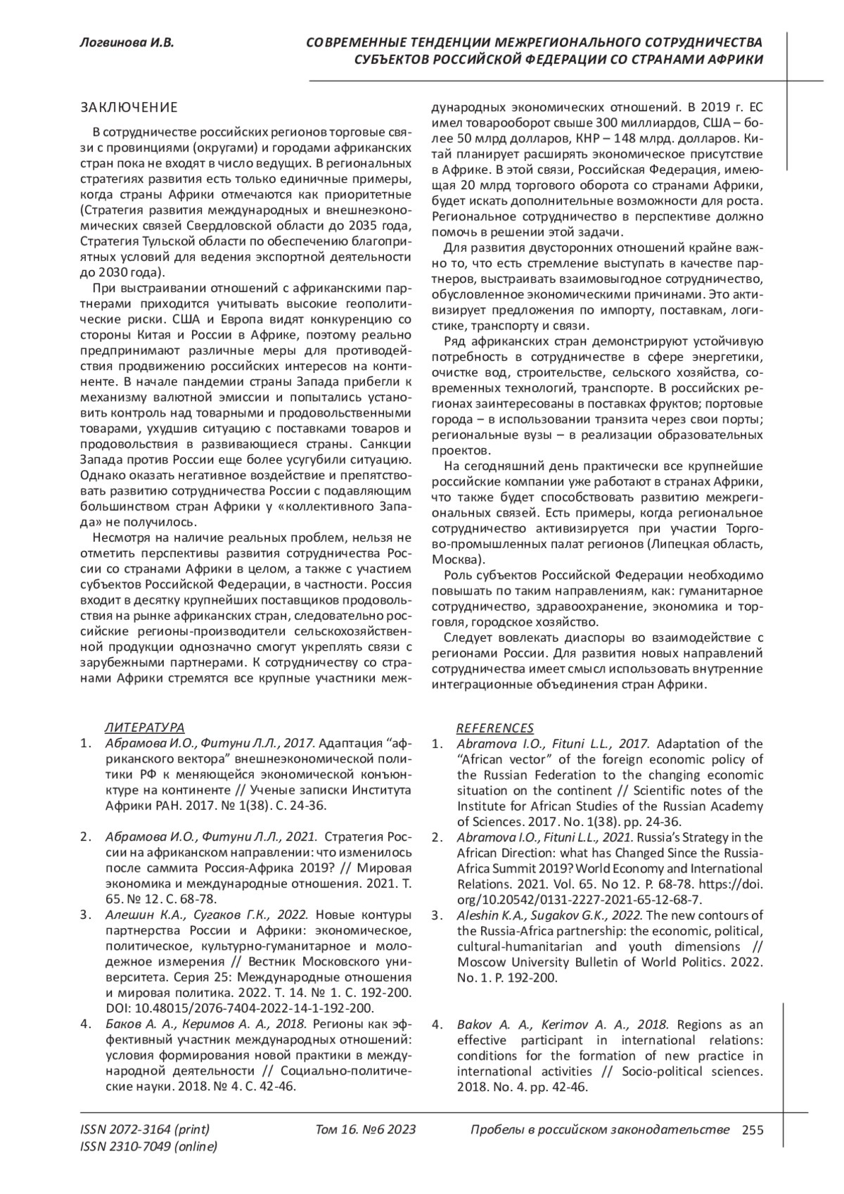 1. Абрамова И.О., Фитуни Л.Л., 2017. Адаптация “африканского вектора” внешнеэкономической политики РФ к меняющейся экономической конъюнктуре на континенте // Ученые записки Института Африки РАН. 2017. № 1(38). С. 24-36. EDN: YPCPPX