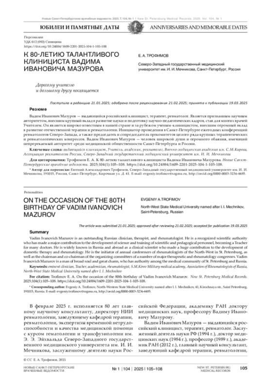 ТРОФИМОВ Е. А. К 80-ЛЕТИЮ ТАЛАНТЛИВОГО Е. А. ТРОФИМОВ КЛИНИЦИСТА ВАДИМА ИВАНОВИЧА МАЗУРОВА // НОВЫЕ САНКТ-ПЕТЕРБУРГСКИЕ ВРАЧЕБНЫЕ ВЕДОМОСТИ. 2025. № 1, ТОМ 104
