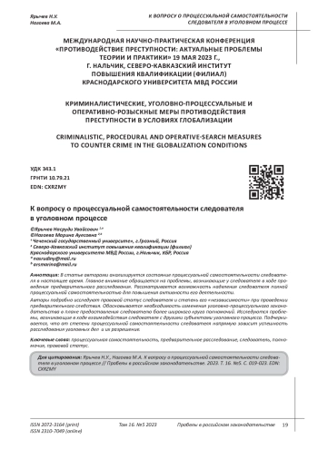 Статья: К ВОПРОСУ О ПРОЦЕССУАЛЬНОЙ САМОСТОЯТЕЛЬНОСТИ СЛЕДОВАТЕЛЯ В УГОЛОВНОМ ПРОЦЕССЕ (2023)
