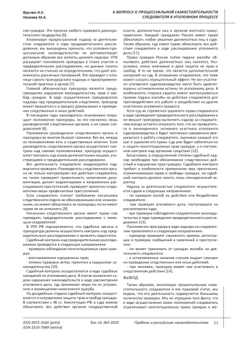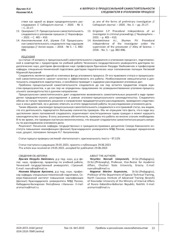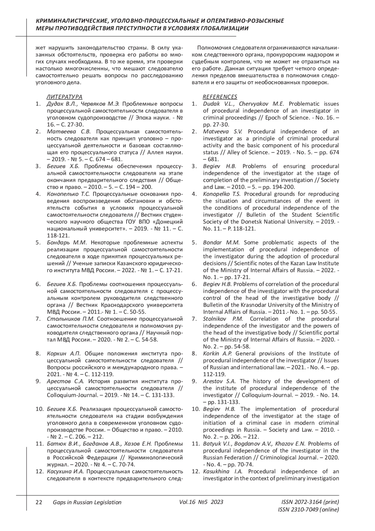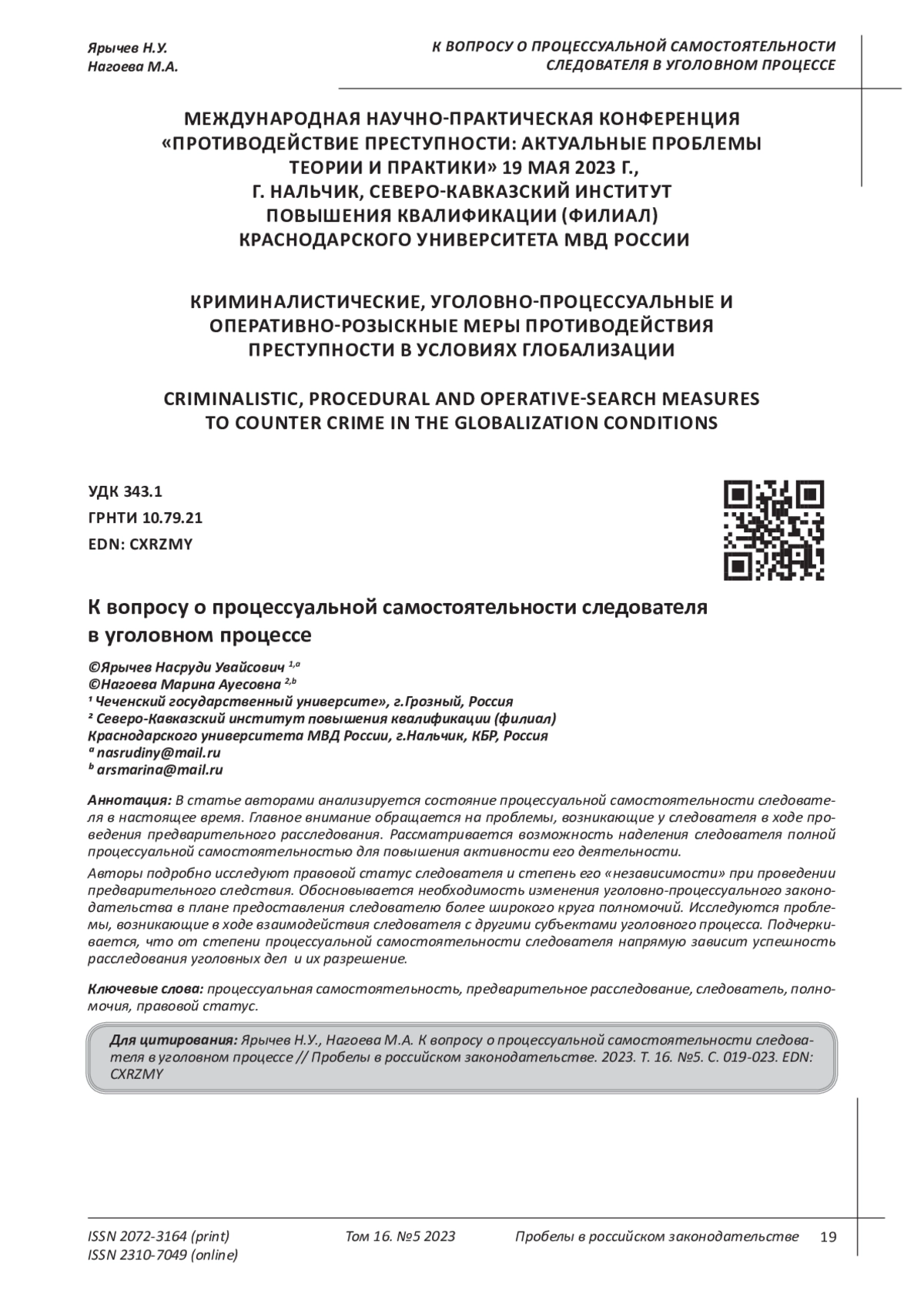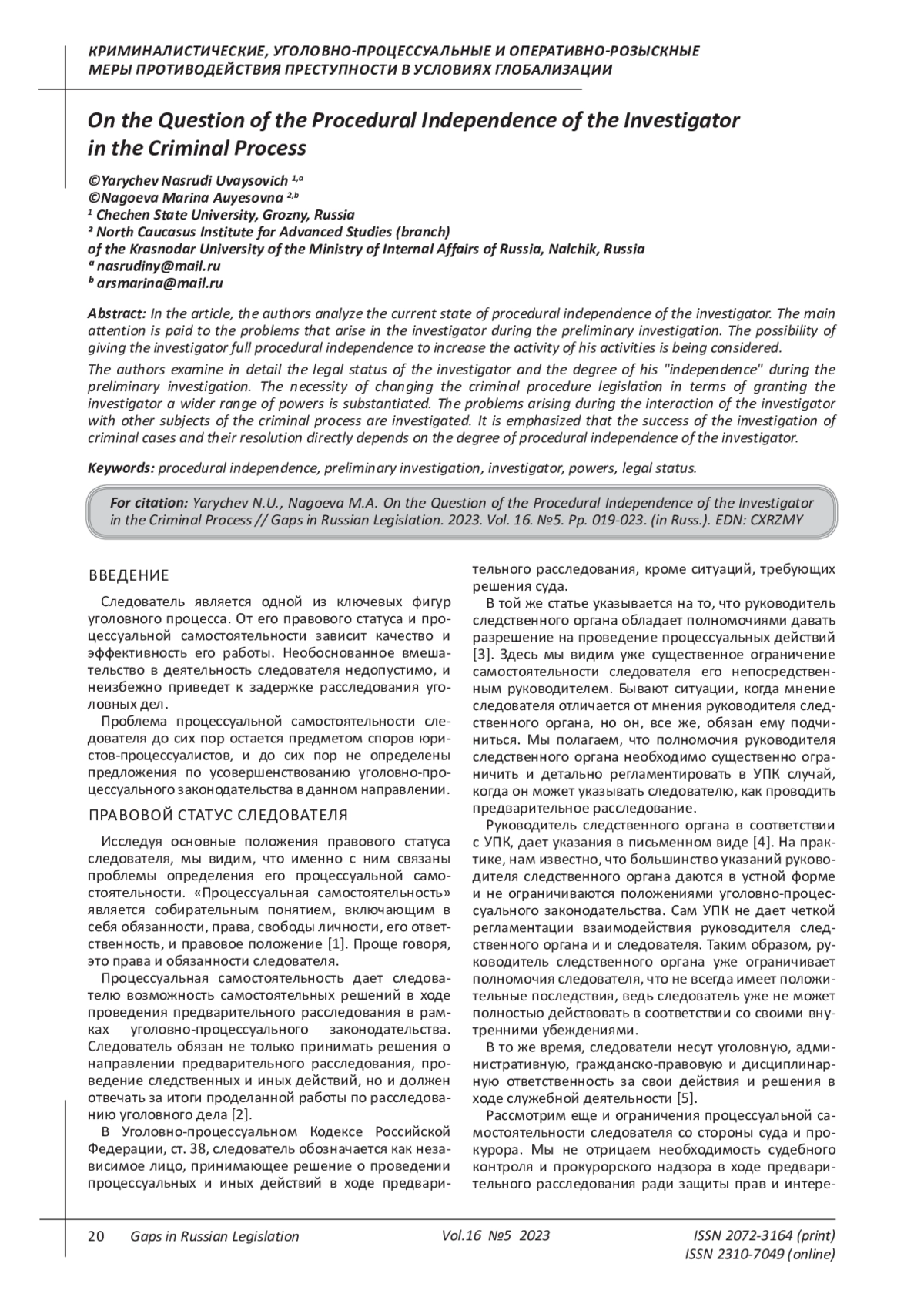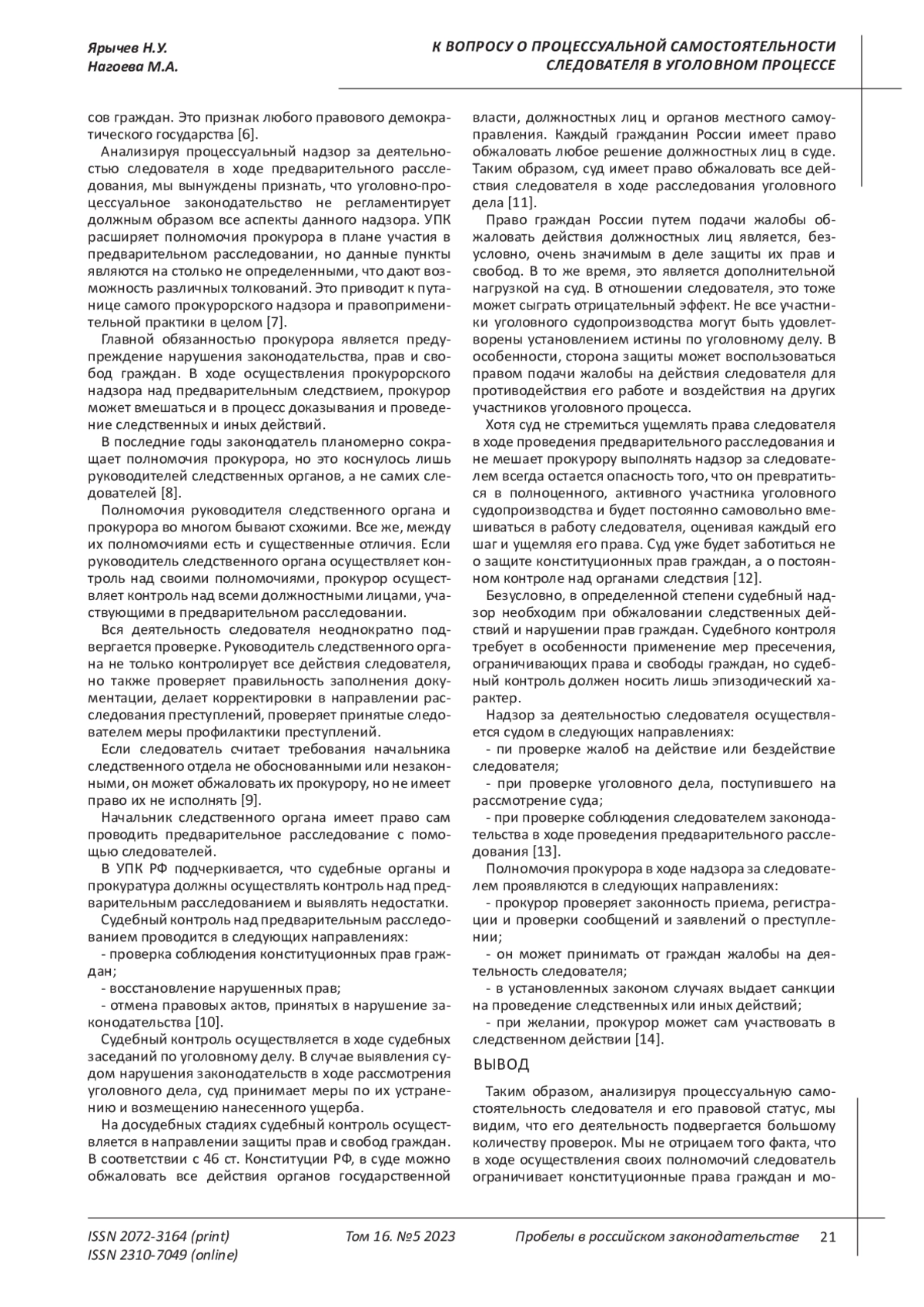 ЯРЫЧЕВ Н. У., НАГОЕВА М. А. К ВОПРОСУ О ПРОЦЕССУАЛЬНОЙ САМОСТОЯТЕЛЬНОСТИ СЛЕДОВАТЕЛЯ В УГОЛОВНОМ ПРОЦЕССЕ // ПРОБЕЛЫ В РОССИЙСКОМ ЗАКОНОДАТЕЛЬСТВЕ. 2023. Т. 16 № 5