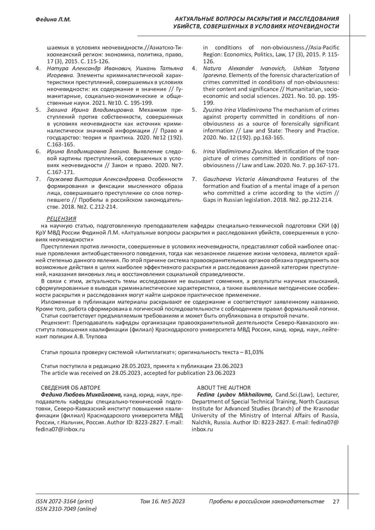6. Ирина Владимировна Зюзина. Выявление следовой картины преступлений, совершенных в условиях неочевидности // Закон и право. 2020. №7. С.167-171. EDN: FPHFRN