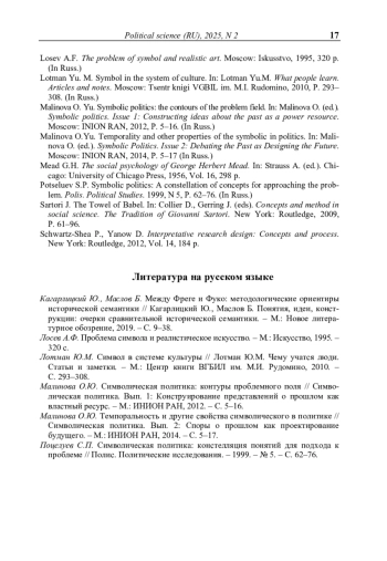 4. Малинова О.Ю. Символическая политика: контуры проблемного поля // Символическая политика. Вып. 1: Конструирование представлений о прошлом как властный ресурс. - М.: ИНИОН РАН, 2012. - С. 5-16.
