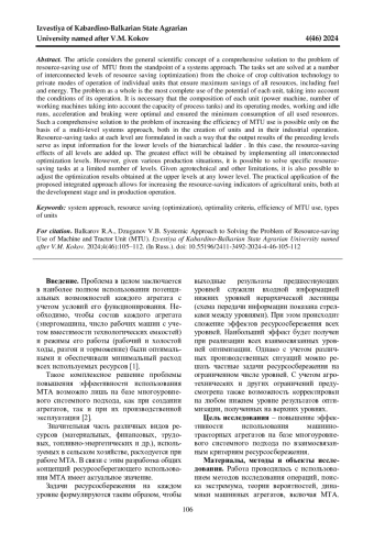 В статье рассматривается общая научная концепция комплексного решения проблемы ресурсосберегающего использования МТА с позиций системного подхода. Поставленные задачи решаются на целом ряде взаимосвязанных уровней ресурсосбережения (оптимизации) от выбора технологии возделывания сельскохозяйственных культур до частных режимов функционирования отдельных агрегатов, обеспечивающих максимальную экономию всех ресурсов, включая топливно-энергетические. Проблема в целом заключается в наиболее полном использовании потенциальных возможностей каждого агрегата с учетом условий его функционирования. Необходимо, чтобы состав каждого агрегата (энергомашина, число рабочих машин с учетом вместимости технологических емкостей) и режимы его работы (рабочий и холостой ходы, разгон и торможение) были оптимальными и обеспечивали минимальный расход всех используемых ресурсов. Такое комплексное решение проблемы повышения эффективности использования МТА возможно лишь на базе многоуровневого системного подхода, как при создании агрегатов, так и при их производственной эксплуатации. Задачи ресурсосбережения на каждом уровне формулируются таким образом, чтобы выходные результаты предшествующих уровней служили входной информацией нижних уровней иерархической лестницы. При этом происходит сложение эффектов ресурсосбережения всех уровней. Наибольший эффект будет получен при реализации всех взаимосвязанных уровней оптимизации. Однако с учетом различных производственных ситуаций можно решать частные задачи ресурсосбережения на ограниченном числе уровней. С учетом агротехнических и других ограничений предусмотрена также возможность корректировки на любом нижнем уровне результатов оптимизации, полученных на верхних уровнях. Практическое применение предлагаемого комплексного подхода позволяет повысить показатели ресурсосбережения сельскохозяйственных агрегатов, как на стадии разработки, так и в производственной эксплуатации.