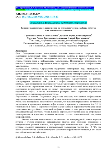 30. Алексеев А.Г., Гречищева Э.С., Вшивцева Т.В. Современные методы лабораторных исследований свойств мерзлых грунтов // Фундаменты. 2021. № 4. С. 16-18.