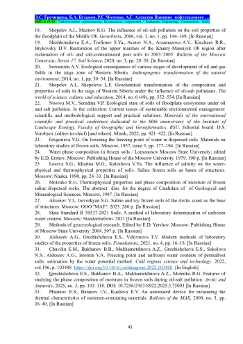 39. Ершов Э.Д., Нефедьева Ю.А., Мотенко Р.Г., Пармузин С.Ю. Прогноз изменения глубины сезонного оттаивания и промерзания грунтов под влиянием нефтяного загрязнения // Вестник МГУ. Серия 4. Геология. 2008. № 6. С. 47-50.