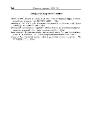 1. Малинова О.Ю. Россия и «Запад» в ХХ веке: трансформация дискурса о коллективной идентичности. - М.: РОССПЭН, 2009. - 190 с.