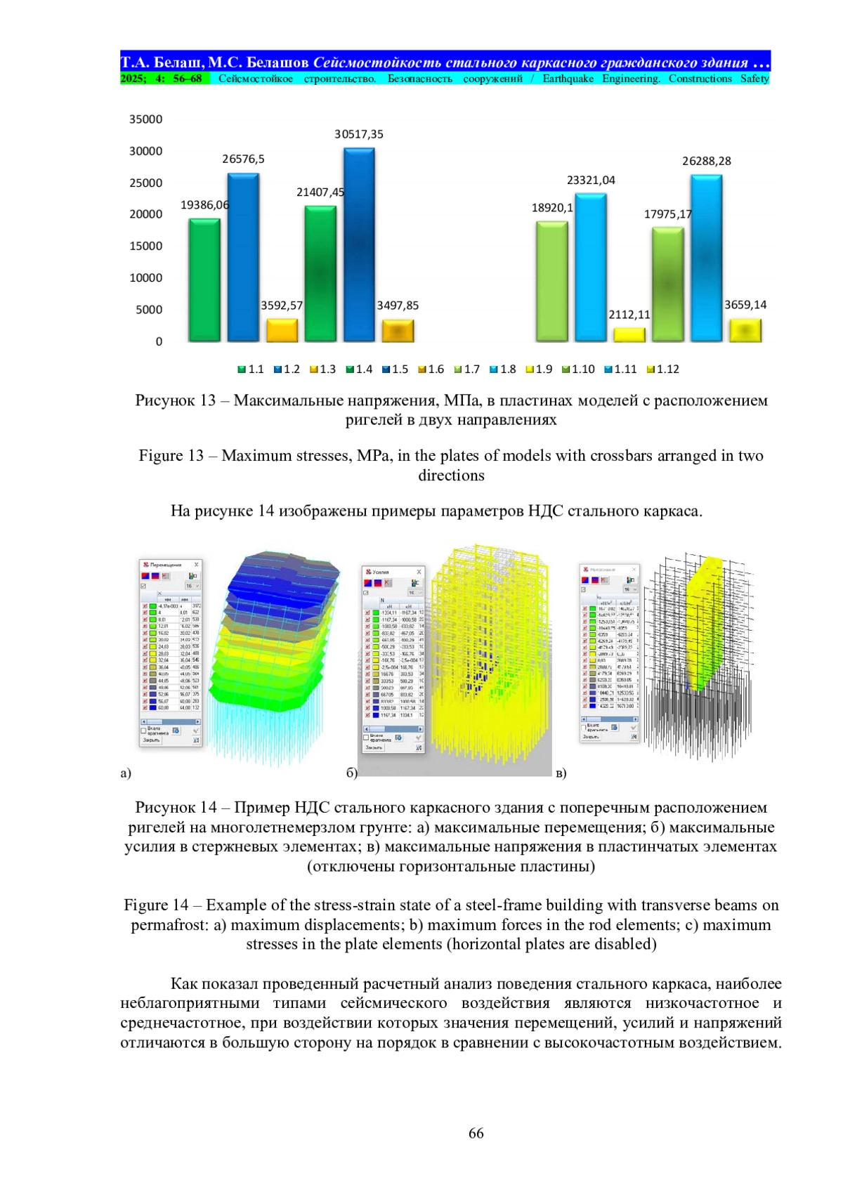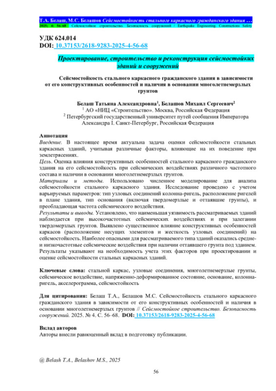 Материалы и методы. Использовано численное моделирование для анализа сейсмостойкости стального каркасного здания. Исследование проведено с учетом варьируемых параметров: тип узловых соединений колонна-ригель, расположение ригелей в плане здания, тип основания (включая твердомерзлые и оттаявшие грунты), и преобладающая частота сейсмического воздействия.