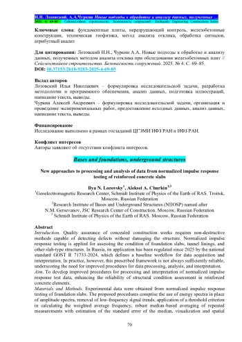 11. Чуркин А.А., Хмельницкий А.Ю., Капустин В.В. Оценка условий контакта конструкций с грунтовым массивом по атрибутам нормированного акустического отклика // Основания, фундаменты и механика грунтов. 2022. № 5. С. 17-21.