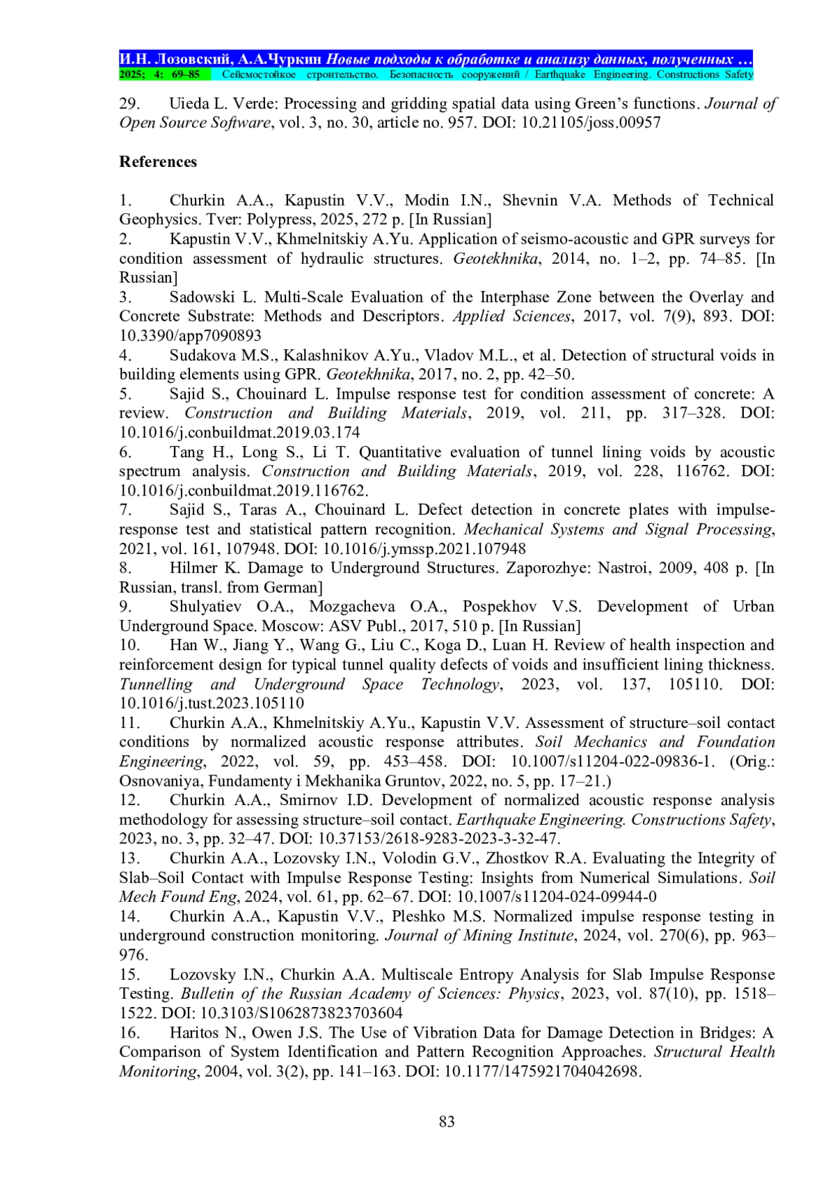 12. Чуркин А.А., Смирнов И.Д. Развитие методики анализа нормированного акустического отклика для оценки контакта конструкция-грунт // Сейсмостойкое строительство. Безопасность сооружений. 2023. № 3. С. 32-47. DOI: 10.37153/2618-9283-2023-3-32-47