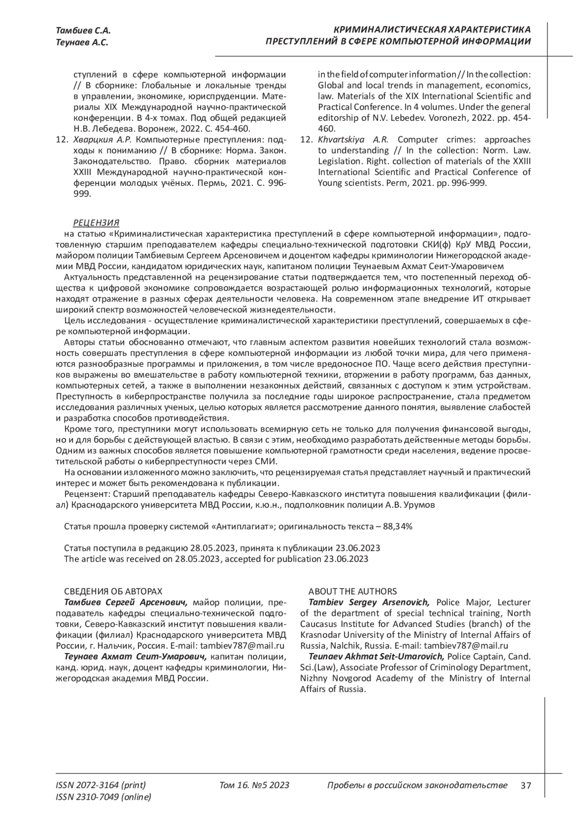 12. Хварцкия А.Р. Компьютерные преступления: подходы к пониманию // В сборнике: Норма. Закон. Законодательство. Право. сборник материалов XXIII Международной научно-практической конференции молодых учёных. Пермь, 2021. С. 996-999. EDN: AQVVKO