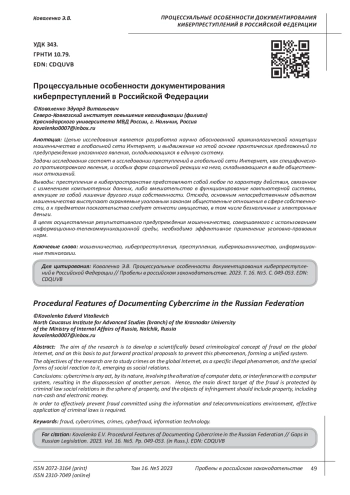 Целью данного исследования было изучение возникновения и развития киберпреступности в РФ. Проанализированы методы борьбы с данным явлением. Киберпреступность - это противоправные действия, совершаемые в виртуальном пространстве с применением различных средств доступа и компьютерных сетей. Это всегда незаконная деятельность, которая осуществляется в цифровой среде и невозможна без использования технических средств, таких как компьютер или смартфон. Распространенным видом преступлений в интернете являются азартные игры онлайн и киберпреследование. Чаще всего жертвы подобных преступлений - взрослые, однако большой процент составляют и несовершеннолетние, которые легко подпадают под влияние преступников. Для эффективной борьбы с киберпреступностью и обеспечению безопасности в киберпространстве потребуется принять ряд мер и скорректировать государственную политику таким образом, чтобы она максимально обеспечивала возможности правоохранительных органов по противодействию киберпреступности. В противодействие преступности входит не только непосредственная борьба с ней уже после совершения преступления, но и принятие мер, которые позволяли бы проводить профилактику и предотвращение преступлений, снижая таким образом их количество. Важно устранить причины и условия, которые позволяют киберпреступникам эффективно действовать. Должна предприниматься деятельность по расследованию преступлений, поиску и привлечению к уголовной ответственности лиц, виновных в совершении преступлений. Последствия совершения противоправного деяния должны быть сведены к минимуму, а в идеале - полностью ликвидированы. Кроме того, эффективной борьбе с данным видом преступления требуется активное международное сотрудничество, в идеале - создание единой конвенции, которую подержат все страны мира или хотя бы максимально технически развитые. Для этого должен быть создан единый документ, однако этот процесс трудоемкий и долгий из-за различий в законодательствах разных стран и споров между их представителями об отдельных пунктах и понимании терминологии в целом.