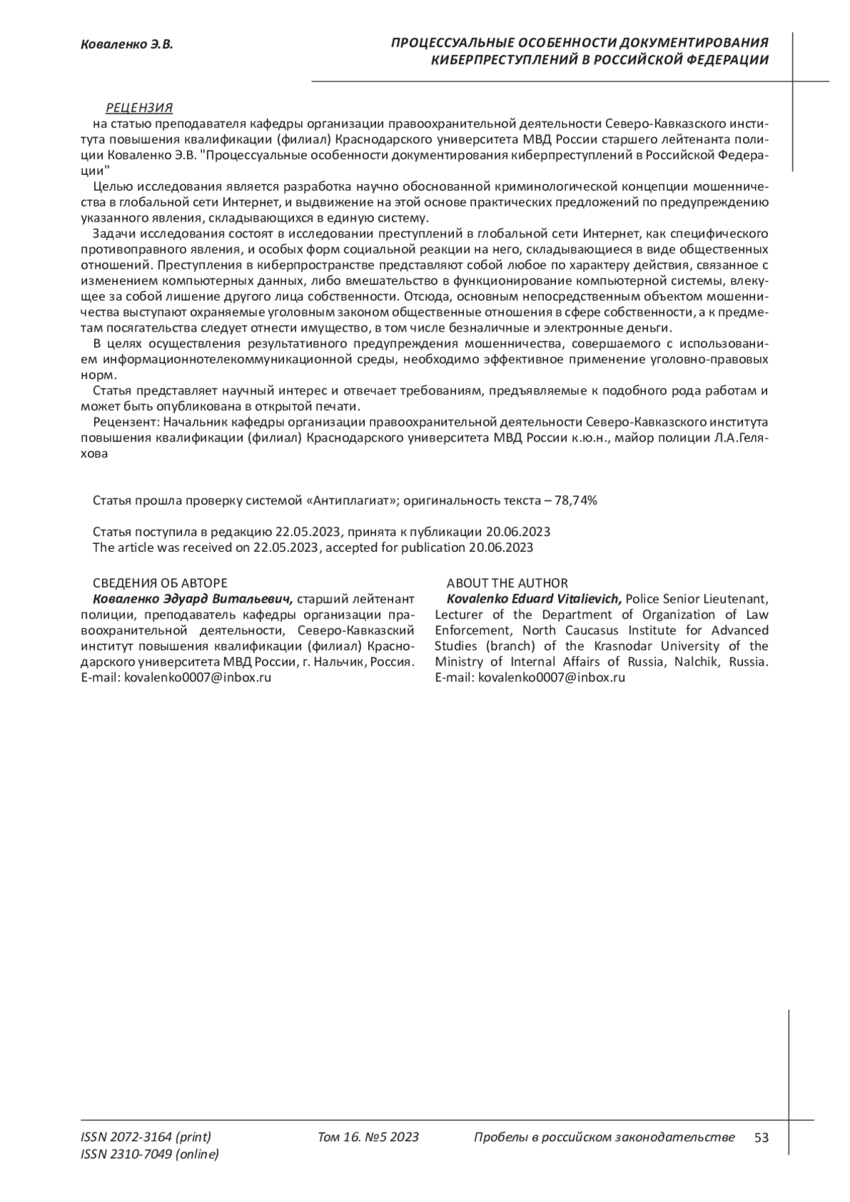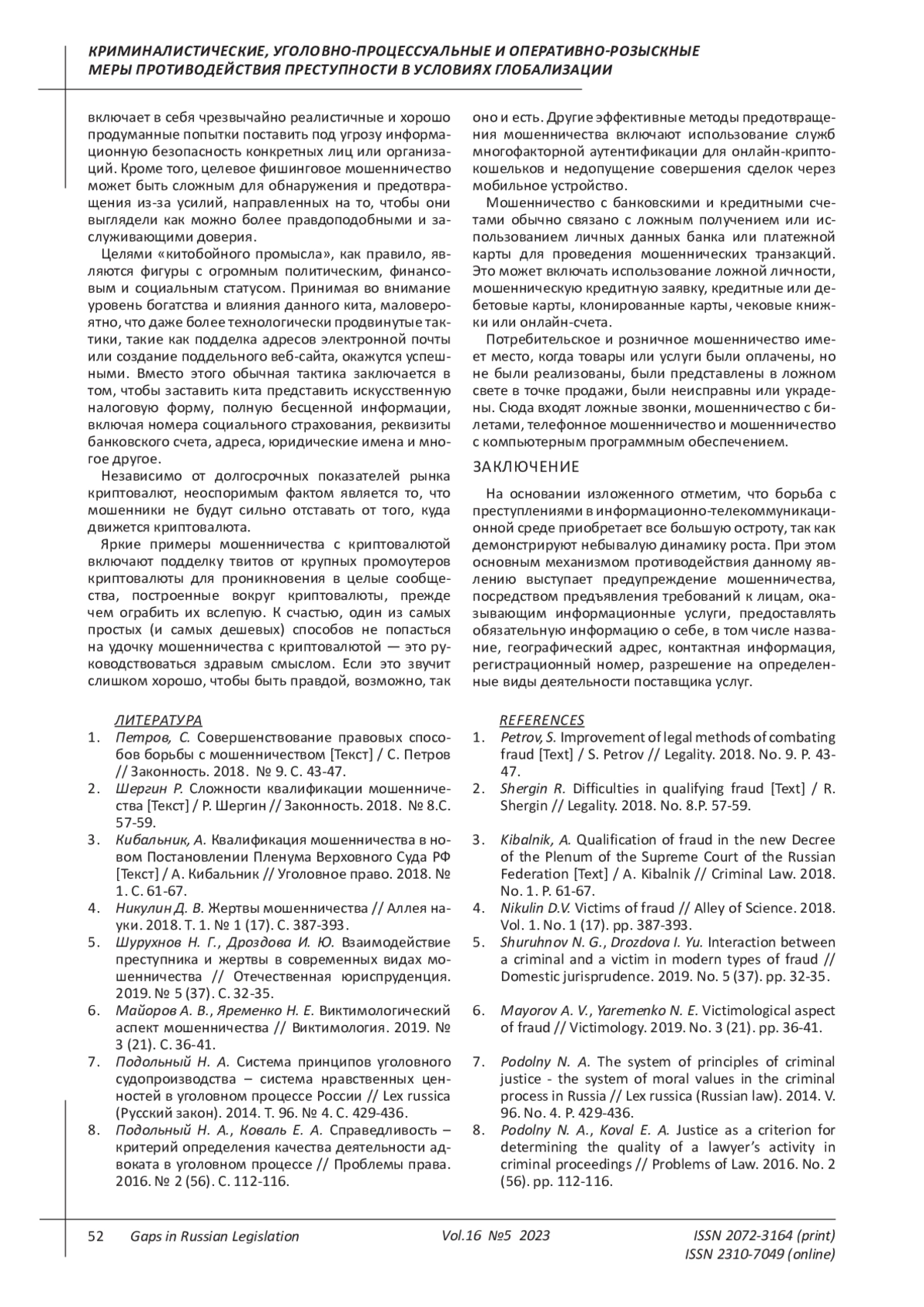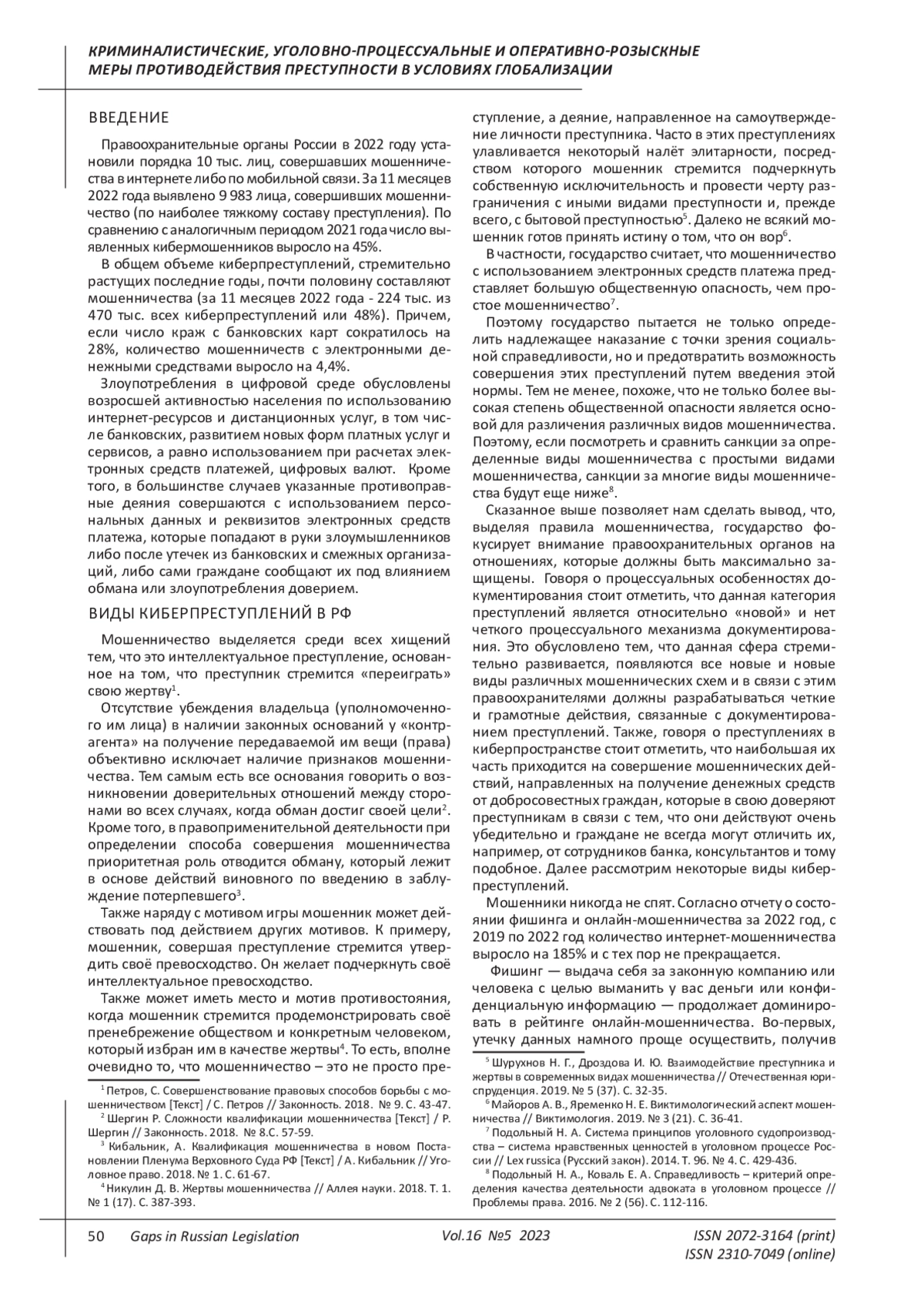 Petrov, S. Improvement of legal methods of combating fraud [Text] / S. Petrov // Legality. 2018. No. 9. P. 43-47. EDN: YVJBNJ