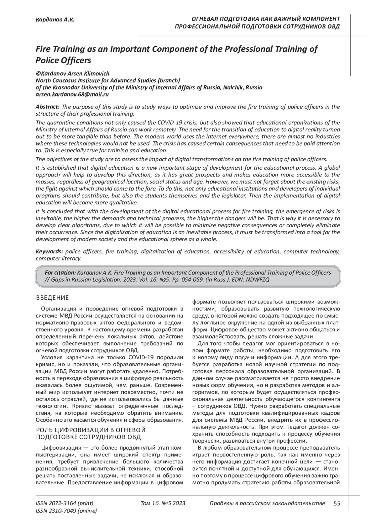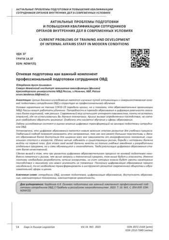 Abidov R.R. Legal foundations of the organization of fire training of police officers // Journal of Applied Research. 2021. Vol. 1. No. 5. pp. 88-91.