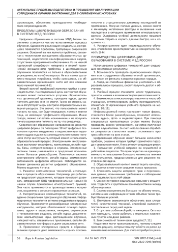 Второй важной проблемой является пробел в законодательстве. На сегодняшний день контингент обучающихся может пользоваться услугами образовательных организаций удаленно, проходить курсы, однако получить диплом они не смогут. Также со стороны закона отсутствуют меры контроля образовательных интернет-ресурсов. Это значит, что пользователь может попасть на курс, где будут передавать ложные знания лица, не имеющие профильного образования. Иначе говоря, можно заплатить мошенникам и не получить ничего взамен или получить не то, что ожидалось. Современное образование направлено на развитие цифровой формы. За последние 10 лет цифровые технологии прочно внедрились в ведомственную подготовку кадров и даже на законодательном уровне получили статус инструмента, который может использовать образовательный процесс. Электронными инструментами выступают смартфоны, компьютеры, онлайн-курсы, базы, интернет-словари и сервисы. Электронные системы также развиваются и предлагают пользователям большое разнообразие.