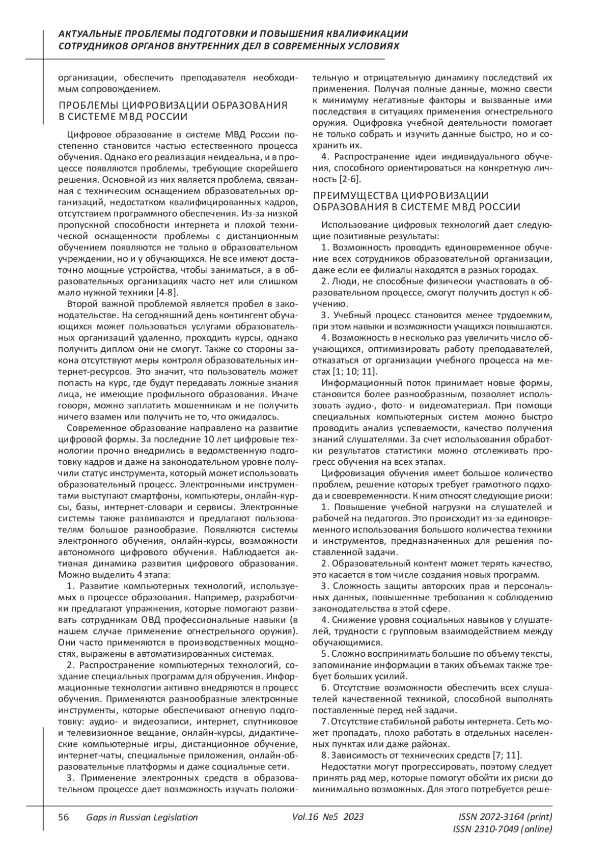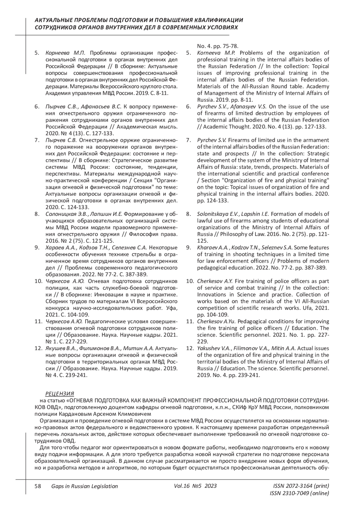 11. Черкесов А.Ю. Педагогические условия совершенствования огневой подготовки сотрудников полиции // Образование. Наука. Научные кадры. 2021. № 1. С. 227-229. EDN: LMAAYA
