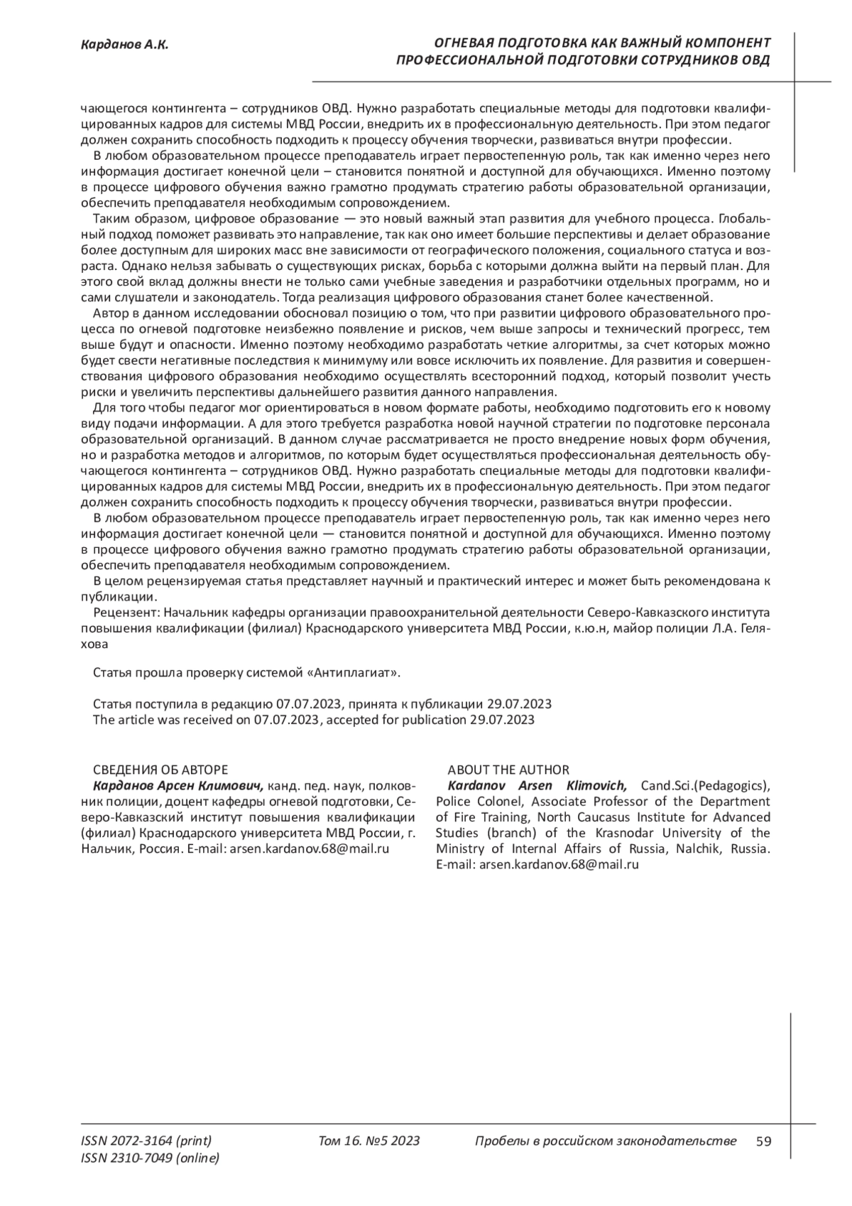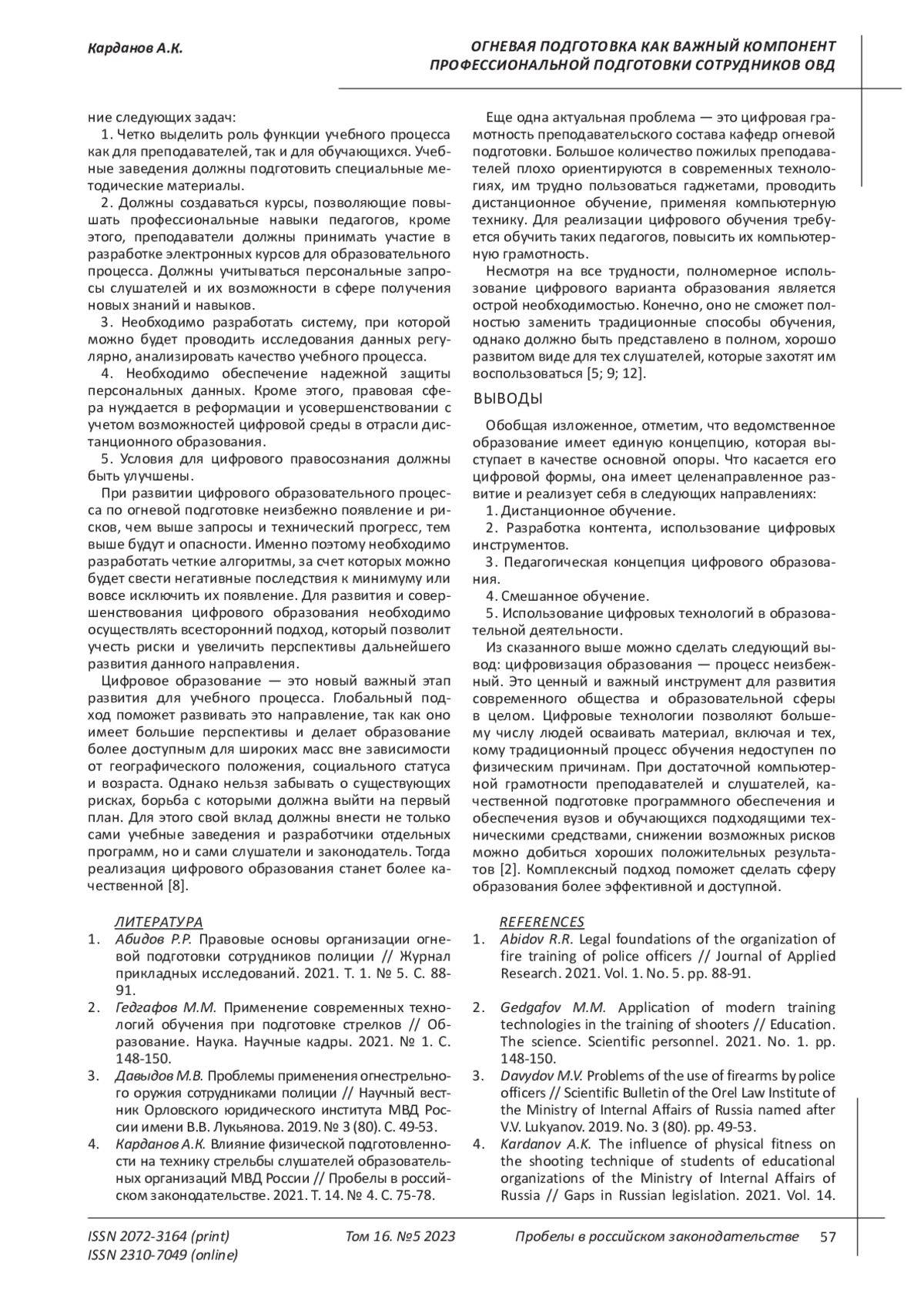 4. Карданов А.К. Влияние физической подготовленности на технику стрельбы слушателей образовательных организаций МВД России // Пробелы в российском законодательстве. 2021. Т. 14. № 4. С. 75-78. EDN: EWVAXC