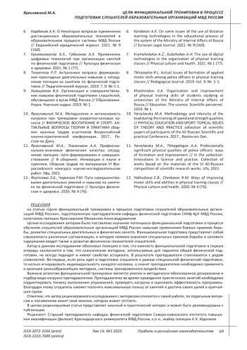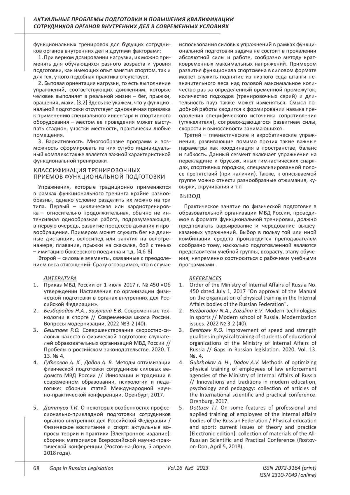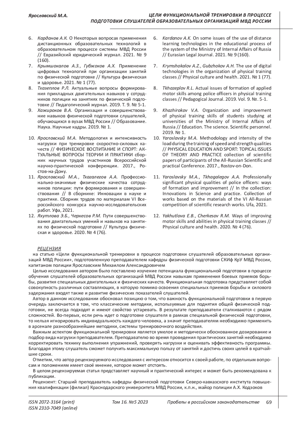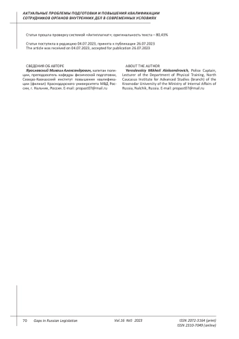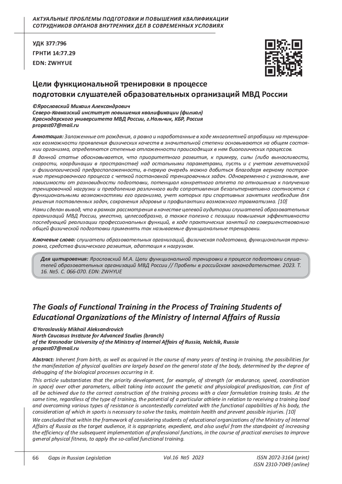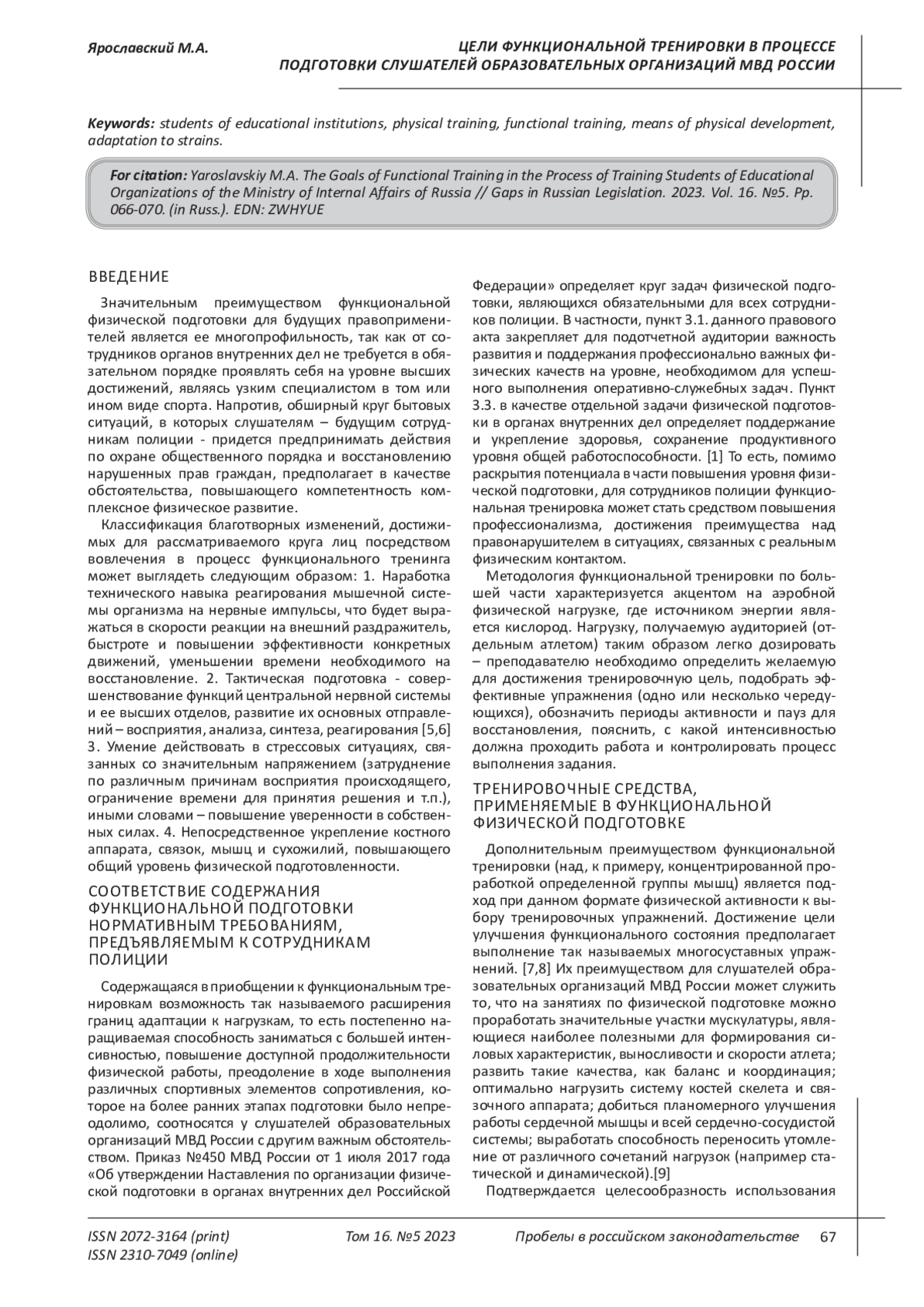 ЯРОСЛАВСКИЙ М. А. ЦЕЛИ ФУНКЦИОНАЛЬНОЙ ТРЕНИРОВКИ В ПРОЦЕССЕ ПОДГОТОВКИ СЛУШАТЕЛЕЙ ОБРАЗОВАТЕЛЬНЫХ ОРГАНИЗАЦИЙ МВД РОССИИ // ПРОБЕЛЫ В РОССИЙСКОМ ЗАКОНОДАТЕЛЬСТВЕ. 2023. Т. 16 № 5