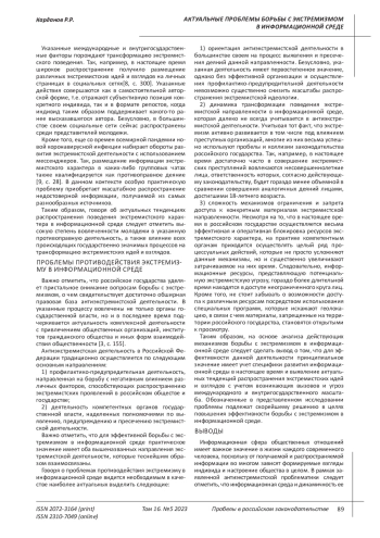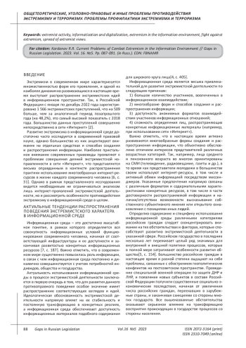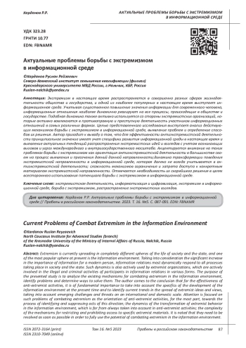 Экстремизм в настоящее время распространяется в совершенно разных сферах жизнедеятельности общества и государства, и одной из наиболее популярных в настоящее время выступает информационная среда. Учитывая существенное повышение значения информации для современного человека, информационные отношения наиболее динамично реагируют на все процессы, происходящие в обществе и государстве. Подобная динамика также активно используется со стороны экстремистских организаций, которые активно вовлекаются в противоправную и преступную деятельность участников информационных отношений в самых различных формах. Целью представленного исследования выступает анализ действующих механизмов борьбы с экстремизмом в информационной среде, выявление проблем и определение способов их решения. Автор приходит к выводу о том, что для эффективности антиэкстремистской деятельности принципиальное значение имеет учет специфики развития информационной среды в настоящее время и выявление актуальных тенденций распространения экстремистских идей и взглядов с учетом возникающих вызовов и угроз международного и внутригосударственного масштаба. Акцентируется внимание на таких проблемах борьбы с экстремизмом как ориентация антиэкстремистской деятельности в большинстве своем на процесс выявления и пресечения деяний данной направленности; динамика трансформации поведения экстремистской направленности в информационной среде, которая далеко не всегда учитывается в антиэкстремистской деятельности; сложность механизмов ограничения и запрета доступа к конкретным материалам экстремистской направленности. Отмечается необходимость их скорейшего решения в целях всестороннего использования потенциала борьбы с экстремизмом в информационной среде.