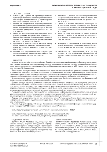 8. Репин И.С. Использование сети Интернет в целях распространения экстремистской идеологии // Вестник Ярославского государственного университета им. П. Г. Демидова. Серия гуманитарные науки. 2022. Т. 16. № 2 (60). С. 294-303. EDN: MWGJLW