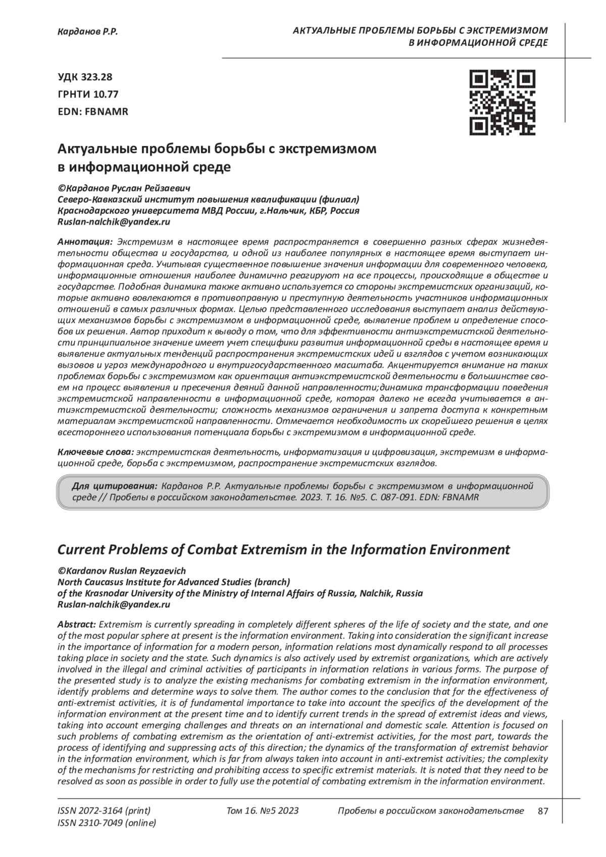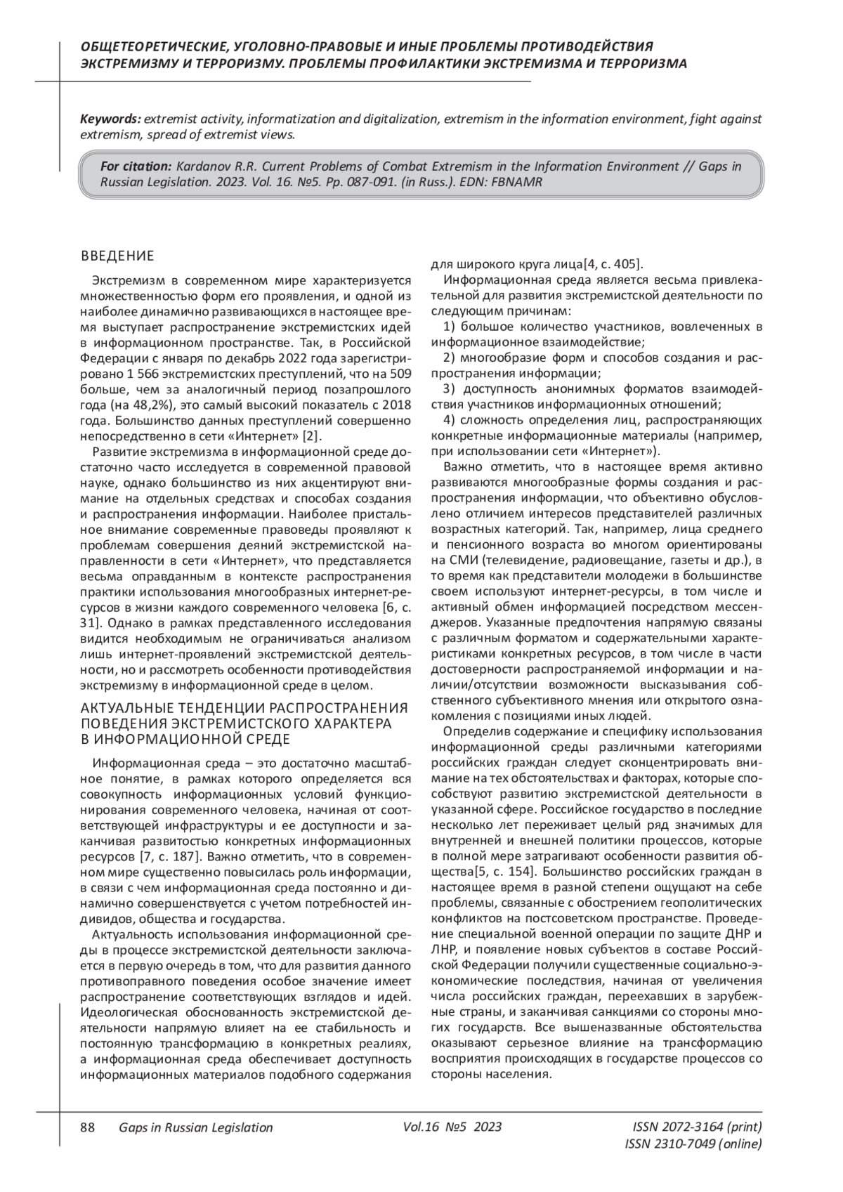 6. Нечевин Д.К., Баранов В.В. Противодействие экстремизму в глобальной компьютерной сети Интернет: история и современность // Административное право и процесс. 2022. № 2. С. 26 - 33. EDN: JRMJRT