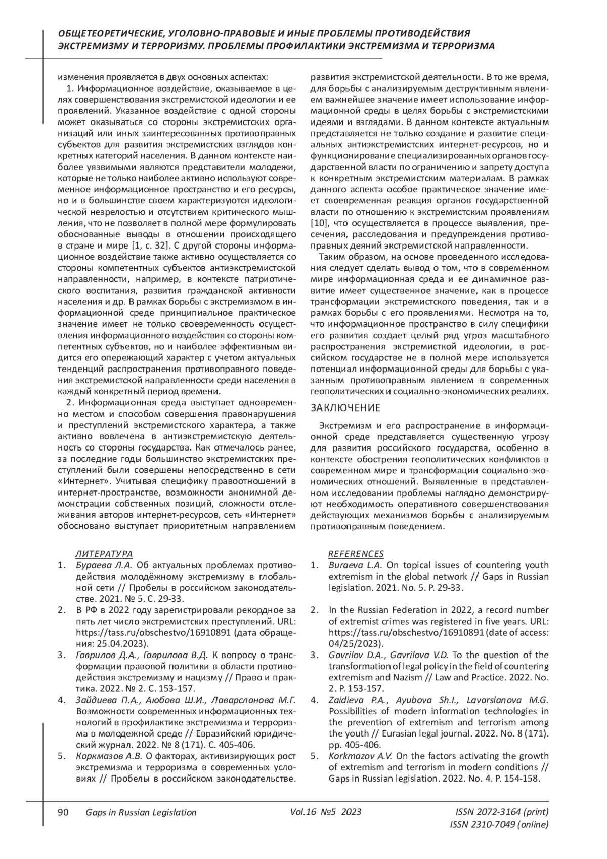 1. Бураева Л.А. Об актуальных проблемах противодействия молодёжному экстремизму в глобальной сети // Пробелы в российском законодательстве. 2021. № 5. С. 29-33. EDN: AAHFLZ