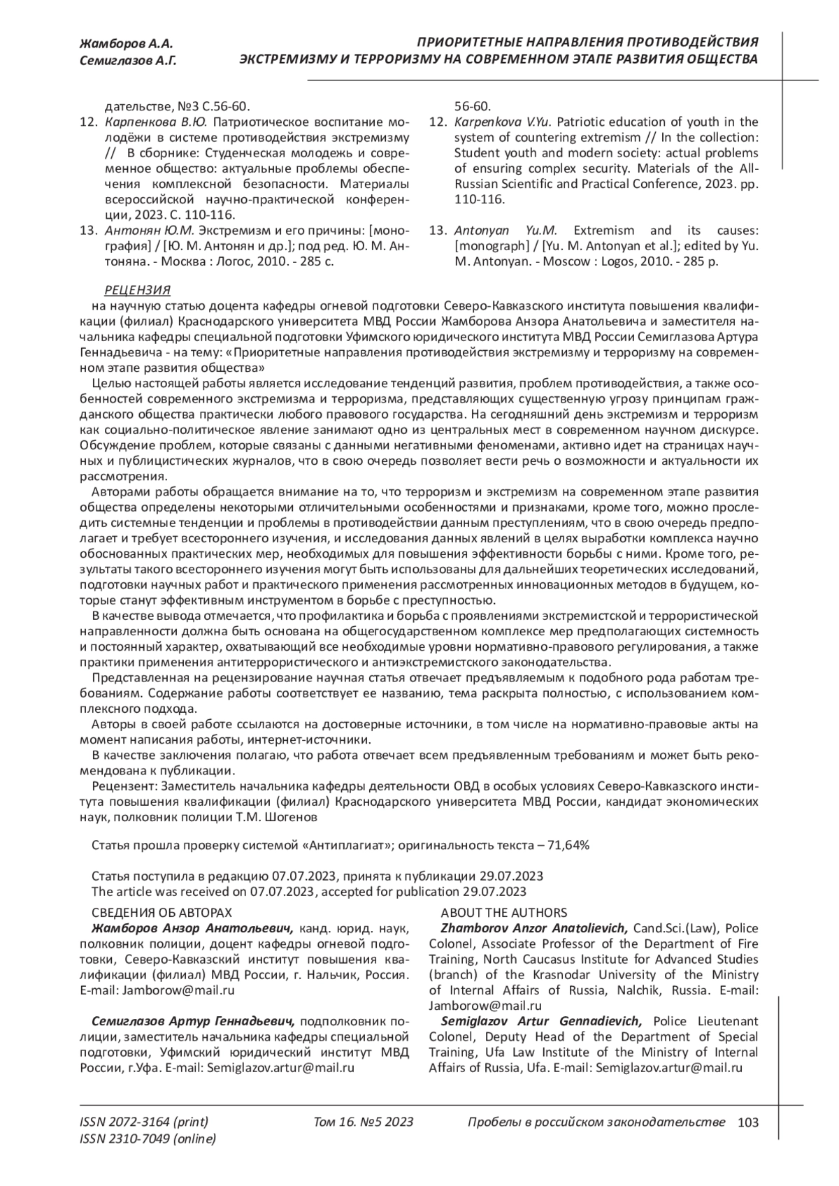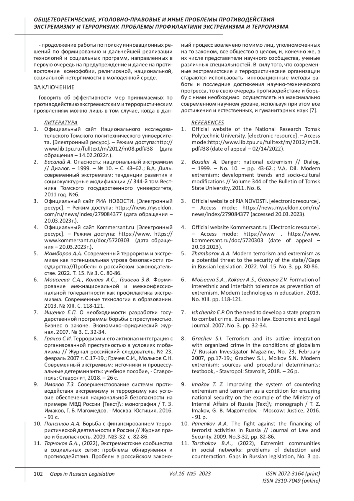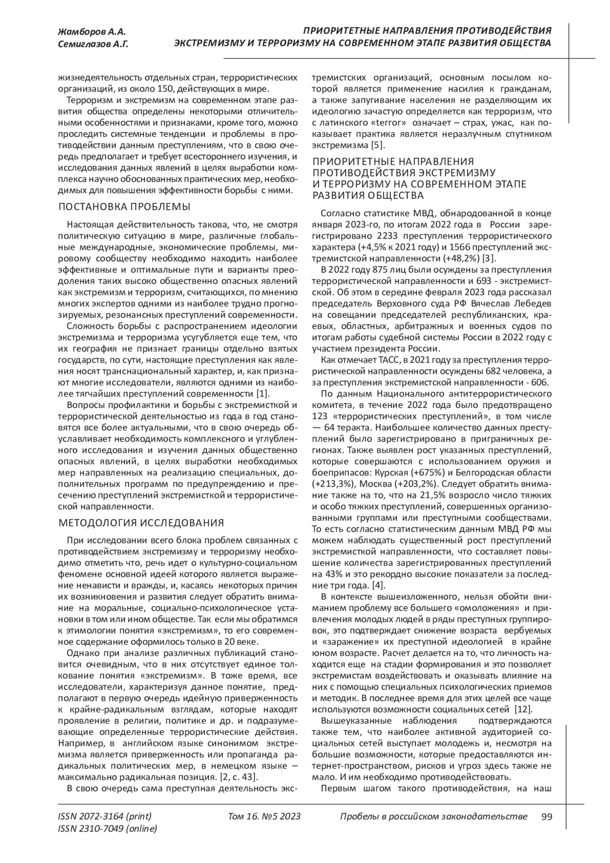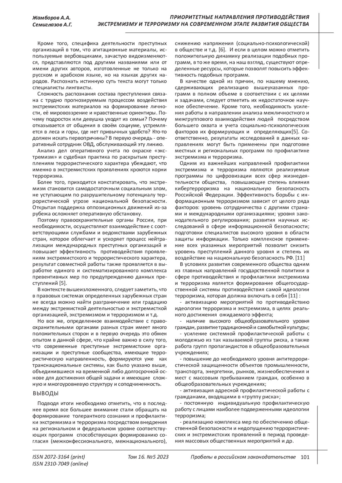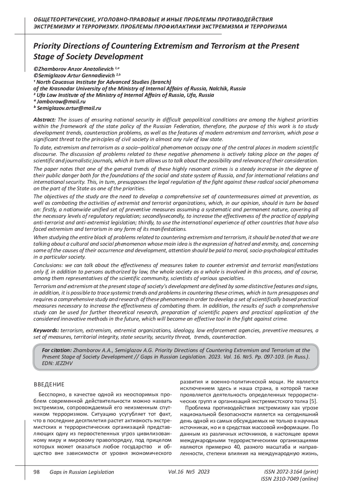 СЕМИГЛАЗОВ А. Г., ЖАМБОРОВ А. А. ПРИОРИТЕТНЫЕ НАПРАВЛЕНИЯ ПРОТИВОДЕЙСТВИЯ ЭКСТРЕМИЗМУ И ТЕРРОРИЗМУ НА СОВРЕМЕННОМ ЭТАПЕ РАЗВИТИЯ ОБЩЕСТВА // ПРОБЕЛЫ В РОССИЙСКОМ ЗАКОНОДАТЕЛЬСТВЕ. 2023. Т. 16 № 5
