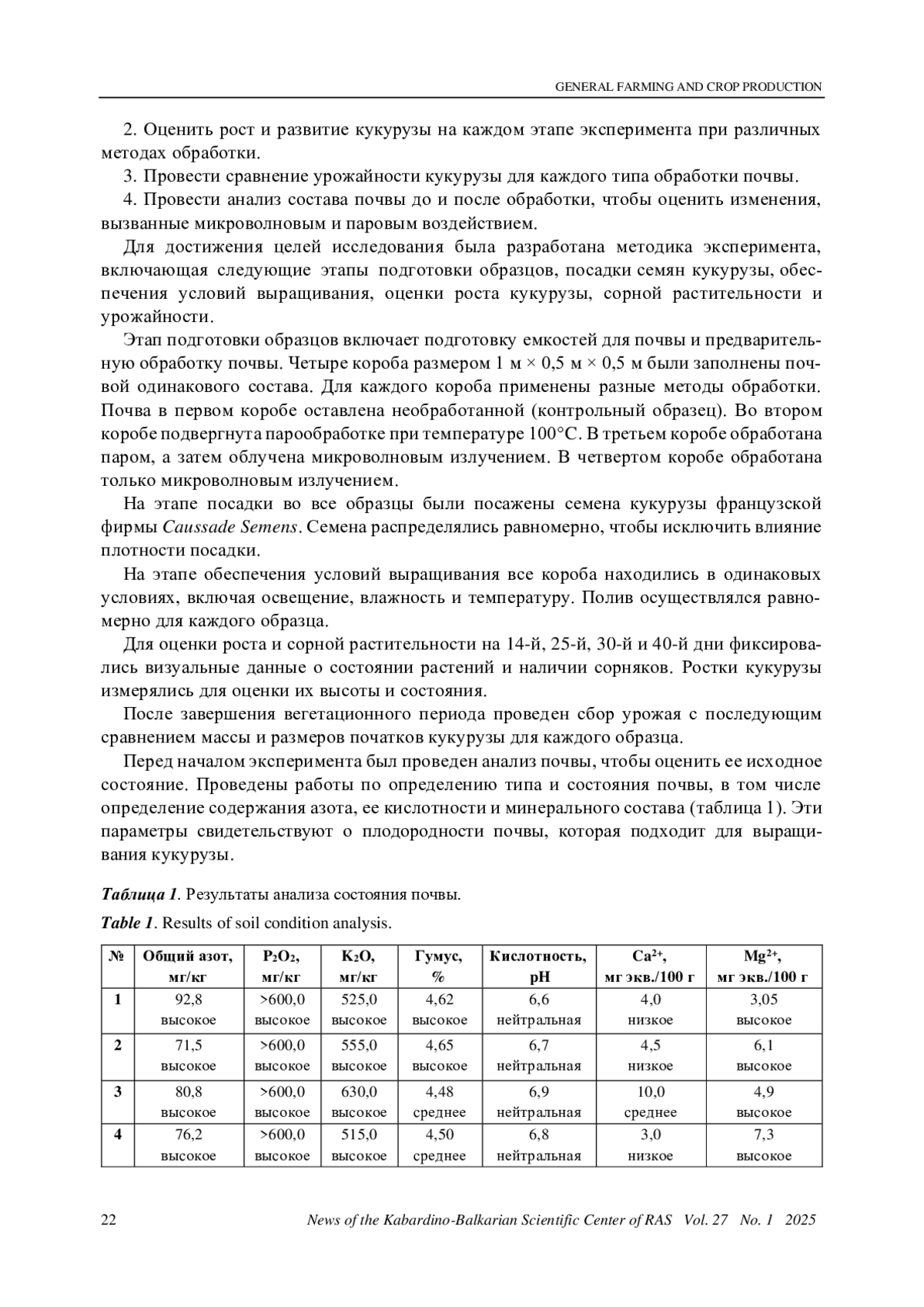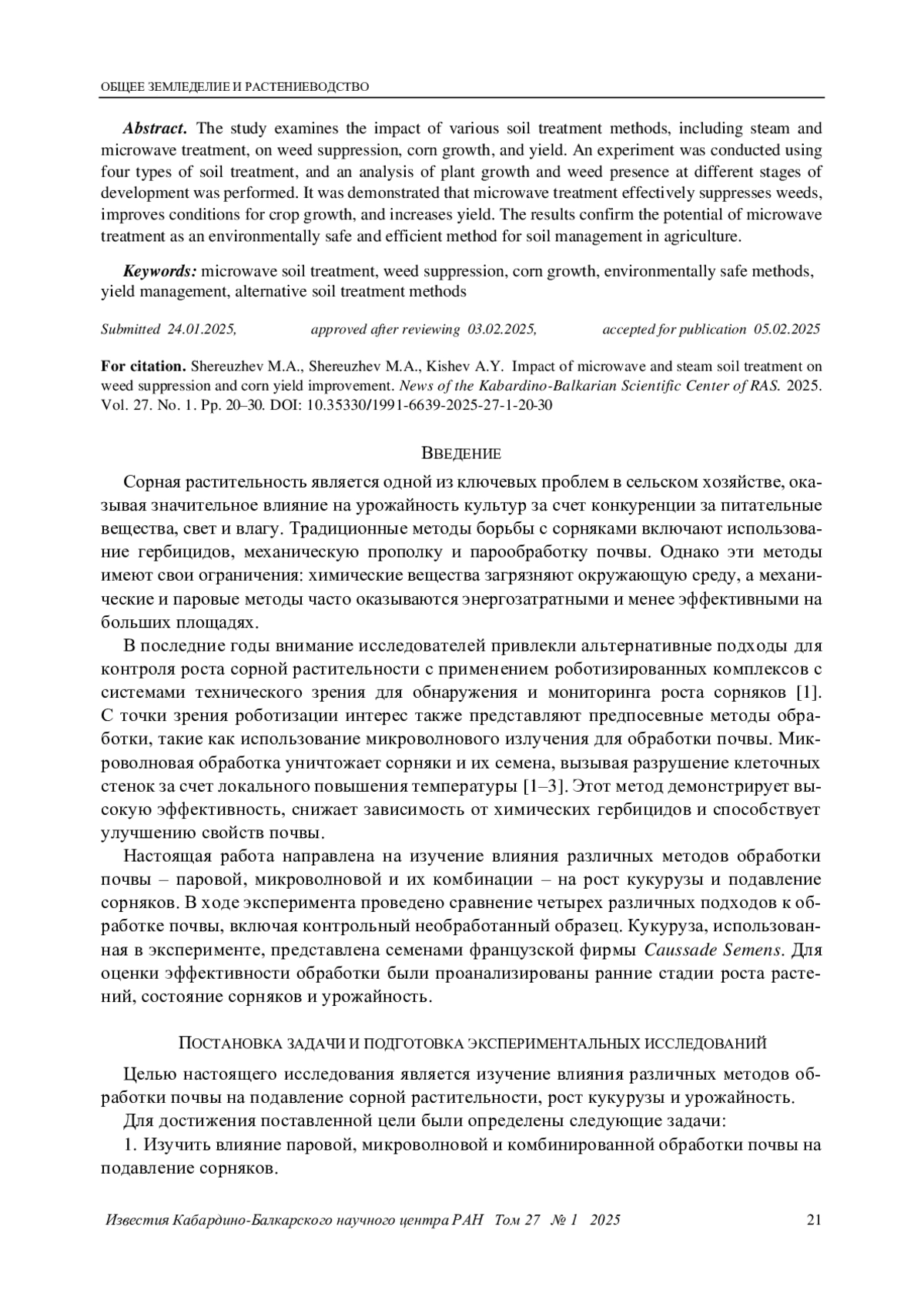 В работе рассмотрено влияние различных методов обработки почвы, включая паровую и микроволновую обработку, на подавление сорной растительности, рост и урожайность кукурузы. Проведен эксперимент с четырьмя типами обработки почвы, выполнен анализ роста растений и сорной растительности на разных этапах развития. Показано, что микроволновая обработка эффективно подавляет сорняки, улучшает условия для роста культурных растений и увеличивает урожайность. Полученные результаты подтверждают перспективность применения микроволнового метода в сельском хозяйстве для экологически безопасного и эффективного управления почвой.
