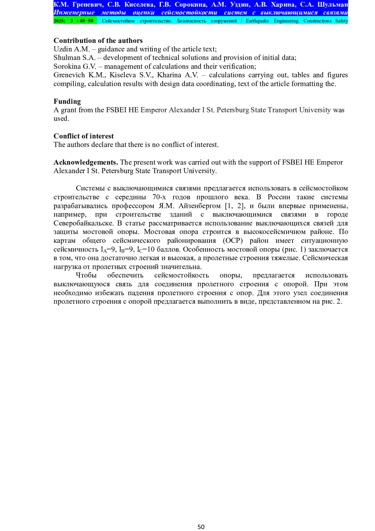 Системы с выключающимися связями предлагается использовать в сейсмостойком строительстве с середины 70-х годов прошлого века. В России такие системы разрабатывались профессором Я. М. Айзенбергом [1, 2], и были впервые применены, например, при строительстве зданий с выключающимися связями в городе Северобайкальске. В статье рассматривается использование выключающихся связей для защиты мостовой опоры. Мостовая опора строится в высокосейсмичном районе. По картам общего сейсмического районирования (ОСР) район имеет ситуационную сейсмичность IA=9, IB=9, IC=10 баллов. Особенность мостовой опоры (рис. 1) заключается в том, что она достаточно легкая и высокая, а пролетные строения тяжелые. Сейсмическая нагрузка от пролетных строений значительна.