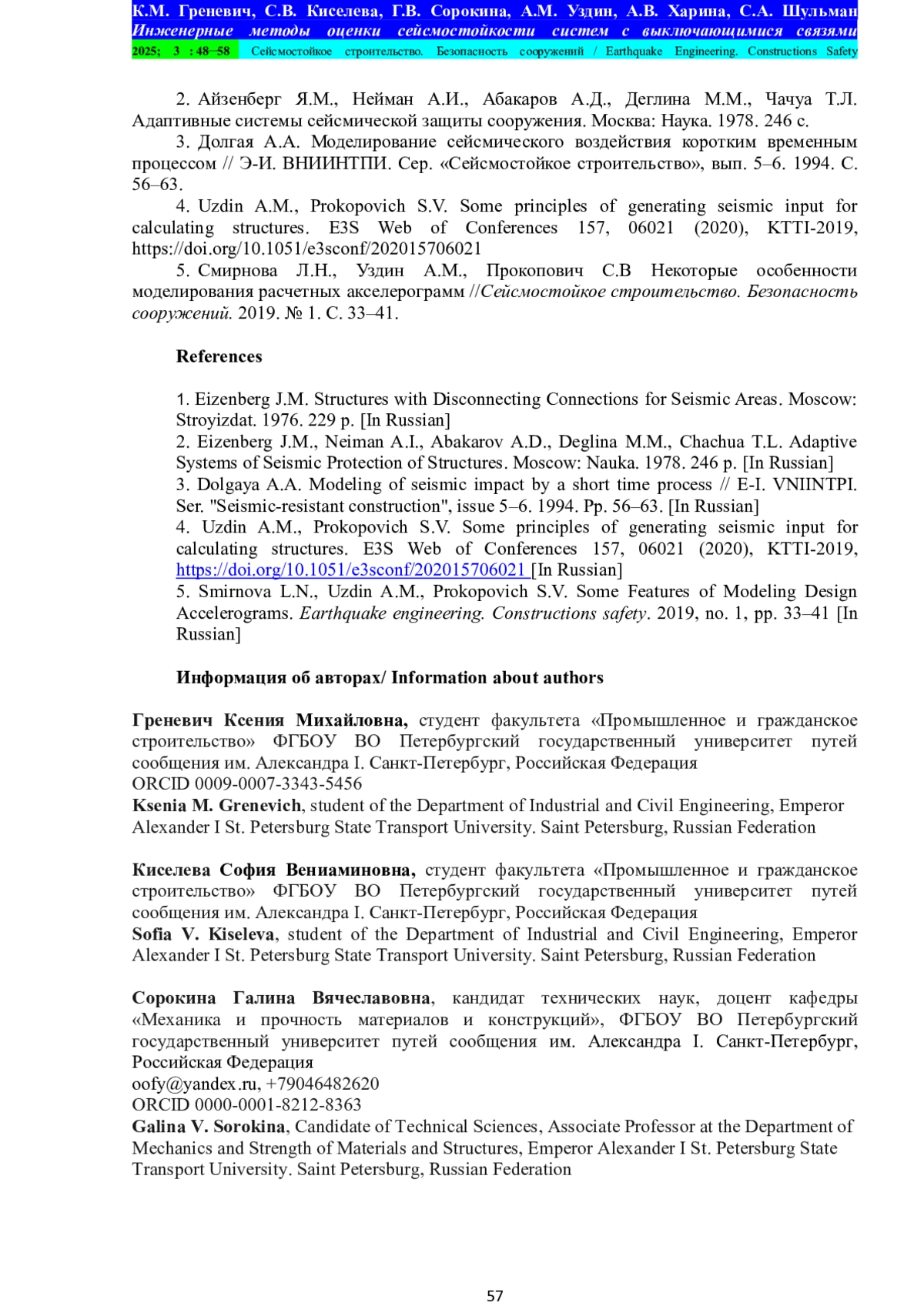 4. Uzdin A.M., Prokopovich S.V. Some principles of generating seismic input for calculating structures. E3S Web of Conferences 157, 06021 (2020), KTTI-2019,. DOI: 10.1051/e3sconf/202015706021