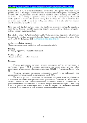Выводы. При техногенных динамических и сейсмических нагрузках должна проводиться оценка разжижения песчаных грунтов в основании зданий и сооружений. По данным зарубежных ученых при коэффициенте FS безопасности от 1.0 до 1.2 возможно разжижение водонасыщенного слоя толщиной 1.5 м в пределах рассматриваемого основания мощностью 7.3 м (6.3 м водонасыщенного песка перекрытого слоем 1.0 м маловлажного грунта). По анализу результатов можно считать, что при динамическом сопротивлении рd более 5.0 МПа практически невозможно разжижение водонасыщенных песков основания. Оценка возможности разжижения песчаных грунтов по данным статического зондирования показала аналогичные закономерности результатов с данными динамического зондирования. Следует иметь в виду, что данная оценка проводилась по данным зондирования, полученным через 1–3 месяца после динамической консолидации песчаных грунтов оснований.