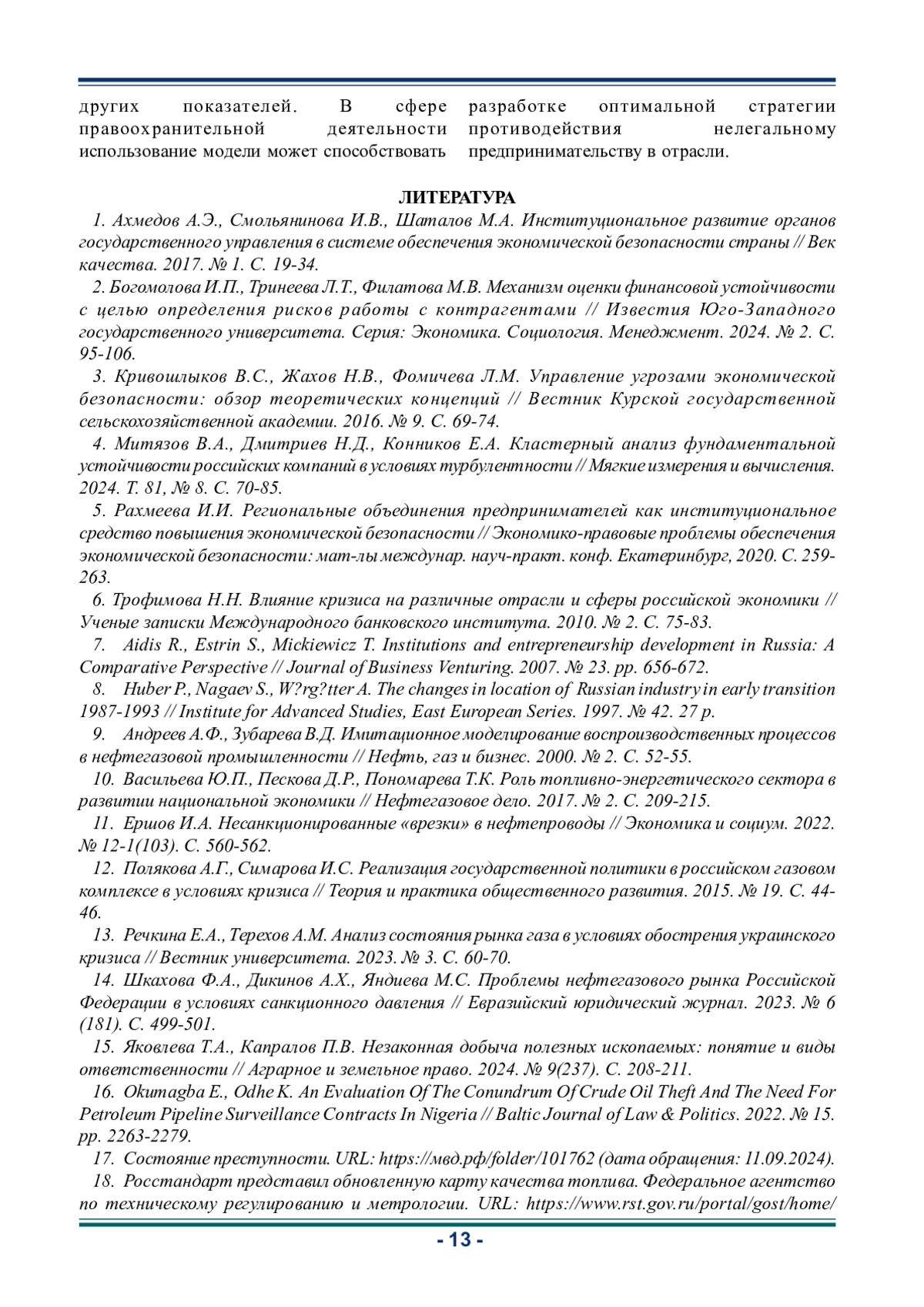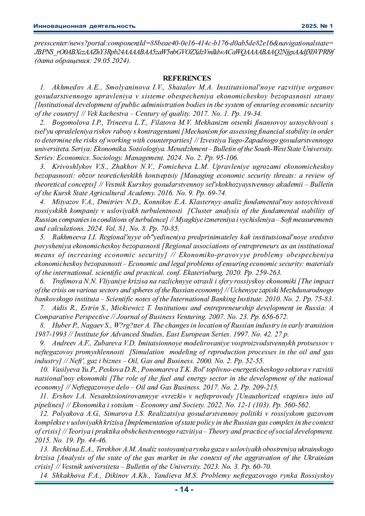 1. Ахмедов А.Э., Смольянинова И.В., Шаталов М.А. Институциональное развитие органов государственного управления в системе обеспечения экономической безопасности страны // Век качества. 2017. № 1. С. 19-34. EDN: YKGFKJ