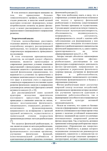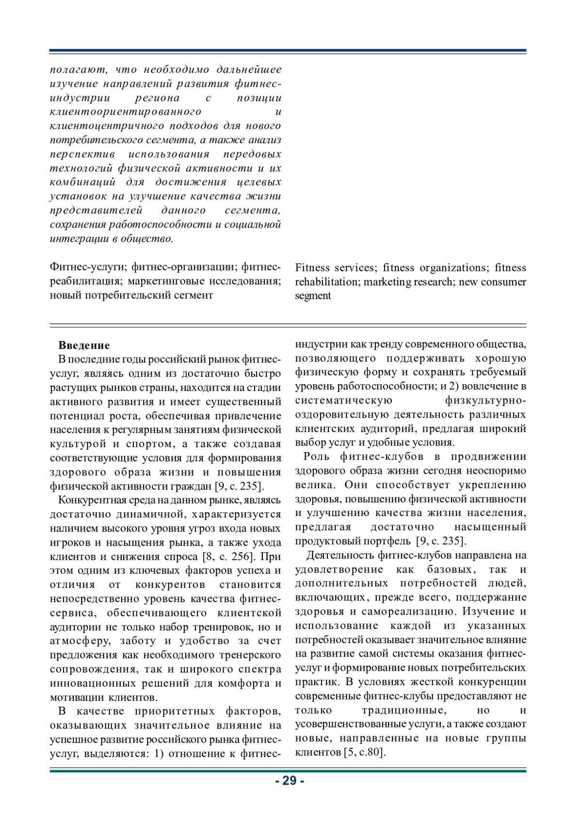 Статья посвящена проблеме развития омского рынка фитнес-услуг и оценке целесообразности внедрения программ фитнес-реабилитации для больных онкологического профиля, находящихся в ремиссии. Цель исследования заключается в формировании необходимой информационно- аналитической базы, позволяющей оценить актуальность и практическую значимость вовлечения фитнес-организаций в процесс реабилитации больных онкологического профиля, в том числе находящихся в стадии ремиссии, и наметить перспективные направления развития их физической реабилитации. Основные результаты теоретического характера заключаются в уточнении трактовки категории «фитнес- реабилитация», имеющей достаточно широкий спектр полезных воздействий, функциональное проявление которых включает как улучшение процессов адаптации и повышение работоспособности, так и формирование способности восстанавливаться в целостной культуре активной жизнедеятельности. К результатам прикладного характера относятся выявление и оценка: 1) вовлеченности фитнес-индустрии Омска в проблему физической и социальной адаптации больных онкологического профиля, в том числе находящихся в ремиссии, а также готовности фитнес-организаций к привлечению данной категории к фитнес-реабилитации и их способности организовать и практически осуществить сам процесс; 2) заинтересованности данной целевой аудитории в перспективах и возможностях фитнес-активности и ее вовлеченность в практическую реализацию процесса. Авторы полагают, что необходимо дальнейшее изучение направлений развития фитнес- индустрии региона с позиции клиентоориентированного и клиентоцентричного подходов для нового потребительского сегмента, а также анализ перспектив использования передовых технологий физической активности и их комбинаций для достижения целевых установок на улучшение качества жизни представителей данного сегмента, сохранения работоспособности и социальной интеграции в общество.
