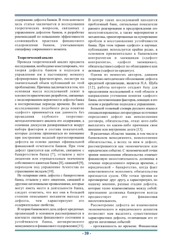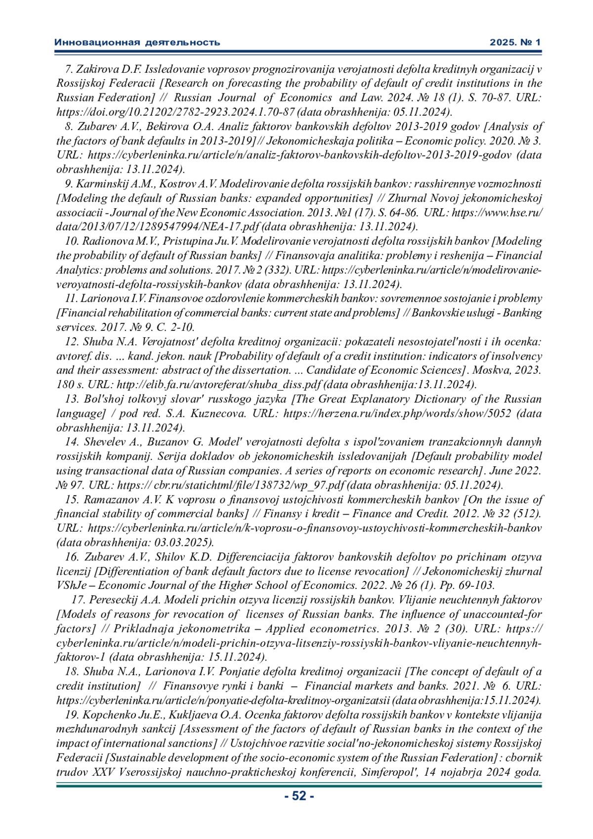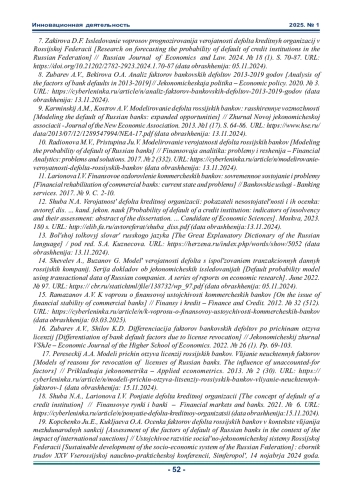 7. Закирова Д.Ф. Исследование вопросов прогнозирования вероятности дефолта кредитных организаций в Российской Федерации // Russian Journal of Economics and Law. 2024. № 18 (1). С. 70-10.21202/2782-2923.2024.1.70-87 (дата обращения: 05.11.2024). DOI: 10.21202/2782-2923.2024.1.70-87( EDN: ZIZXWY