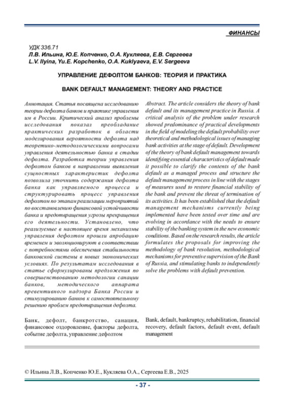 Статья посвящена исследованию теории дефолта банков и практике управления им в России. Критический анализ проблемы исследования показал преобладание практических разработок в области моделирования вероятности дефолта над теоретико-методологическими вопросами управления деятельностью банка в стадии дефолта. Разработка теории управления дефолтом банков в направлении выявления сущностных характеристик дефолта позволила уточнить содержания дефолта банка как управляемого процесса и структурировать процесс управления дефолтом по этапам реализации мероприятий по восстановлению финансовой устойчивости банка и предотвращения угрозы прекращения его деятельности. Установлено, что реализуемые в настоящее время механизмы управления дефолтом прошли апробацию временем и эволюционируют в соответствии с потребностями обеспечения стабильности банковской системы в новых экономических условиях. По результатам исследования в статье сформулированы предложения по совершенствованию методологии санации банков, методического аппарата превентивного надзора Банка России и стимулированию банков к самостоятельному решению проблем предотвращения дефолта.