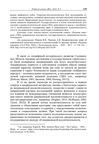 Миф об американской исключительности хотя и подвергается критике и деконструкции, в том числе в академических кругах, по-прежнему продолжает играть важную роль в политических процессах в США, что делает актуальным выявление механизмов его воспроизводства. Настоящее исследование представляет собой попытку внести вклад в приращение научного знания в обозначенной проблемной области посредством ответа на вопрос о том, какие политические символы используются сегодня для поддержания этого мифа. Он, в частности, основывается на представлениях об американской государственности, американских ценностях и американском могуществе. Обращаясь к анализу кинематографа как форме публичного дискурса, авторы выбрали объектом исследования кинокартину «Падение империи» (Civil War). Центральное место в киноленте занимает крушение государственности и могущества США на фоне внутреннего вооруженного конфликта, что делает произведение ценным эмпирическим материалом. Авторы ставят перед собой задачу выявления символов, которые участвуют в воспроизводстве мифа об американской исключительности в рамках выбранного кейса. Теоретико-методологическую базу исследования составляет конструктивизм, основным прикладным методом выступает качественный контент-анализ. Проведенный анализ показал, что посредством демонстрации крушения символов американской государственности и основ экономической, ценностной и военно-политической мощи США транслируется мысль о неизбежности и необходимости поддержания веры в американскую исключительность; отказ от нее равнозначен концу самой нации в нынешнем виде.