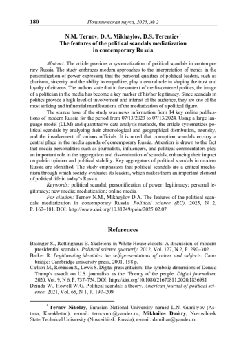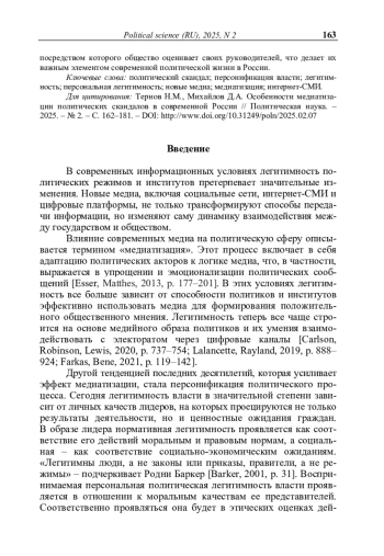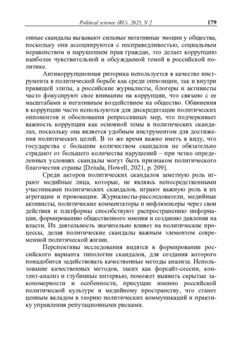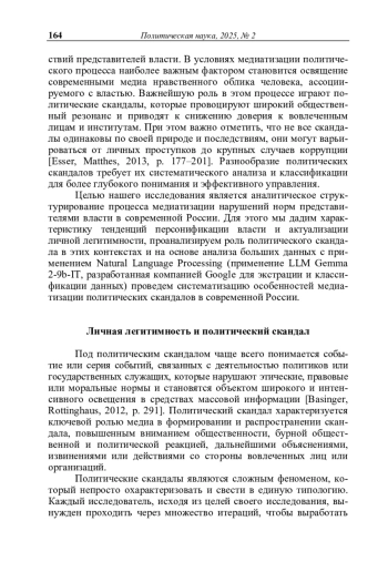 В статье дается систематизация политических скандалов в современной России. В качестве теоретической основы исследования выступили современные подходы к интерпретации тенденций персонификации власти, выражающиеся в том, что личные качества политических лидеров, такие как харизма, искренность и способность к эмпатии, стали играть центральную роль в формировании доверия и лояльности граждан. Авторы также исходят из того, что в условиях медиацентрированной политики образ политика в СМИ стал ключевым маркером его легитимности. Поскольку скандалы в политике обеспечивают высокий уровень вовлеченности и интереса аудитории, они являются одним из наиболее ярких и влиятельных проявлений медиатизации политической фигуры.