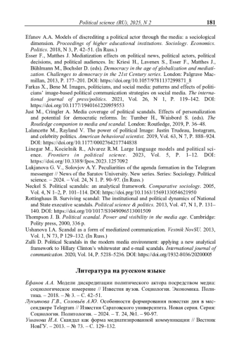 1. Ефанов А.А. Модели дискредитации политического актора посредством медиа: социологическое измерение // Известия вузов. Социология. Экономика. Политика. - 2018. - № 3. - С. 42-51.