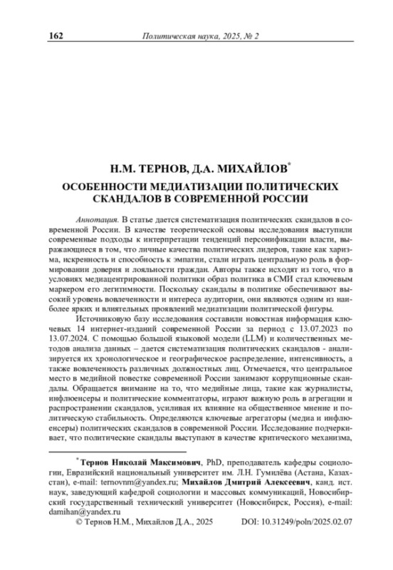 Источниковую базу исследования составили новостная информация ключевых 14 интернет-изданий современной России за период с 13.07.2023 по 13.07.2024. С помощью большой языковой модели (LLM) и количественных методов анализа данных – дается систематизация политических скандалов - анализируется их хронологическое и географическое распределение, интенсивность, а также вовлеченность различных должностных лиц. Отмечается, что центральное место в медийной повестке современной России занимают коррупционные скандалы. Обращается внимание на то, что медийные лица, такие как журналисты, инфлюенсеры и политические комментаторы, играют важную роль в агрегации и распространении скандалов, усиливая их влияние на общественное мнение и политическую стабильность. Определяются ключевые агрегаторы (медиа и инфлюенсеры) политических скандалов в современной России. Исследование подчеркивает, что политические скандалы выступают в качестве критического механизма, посредством которого общество оценивает своих руководителей, что делает их важным элементом современной политической жизни в России.