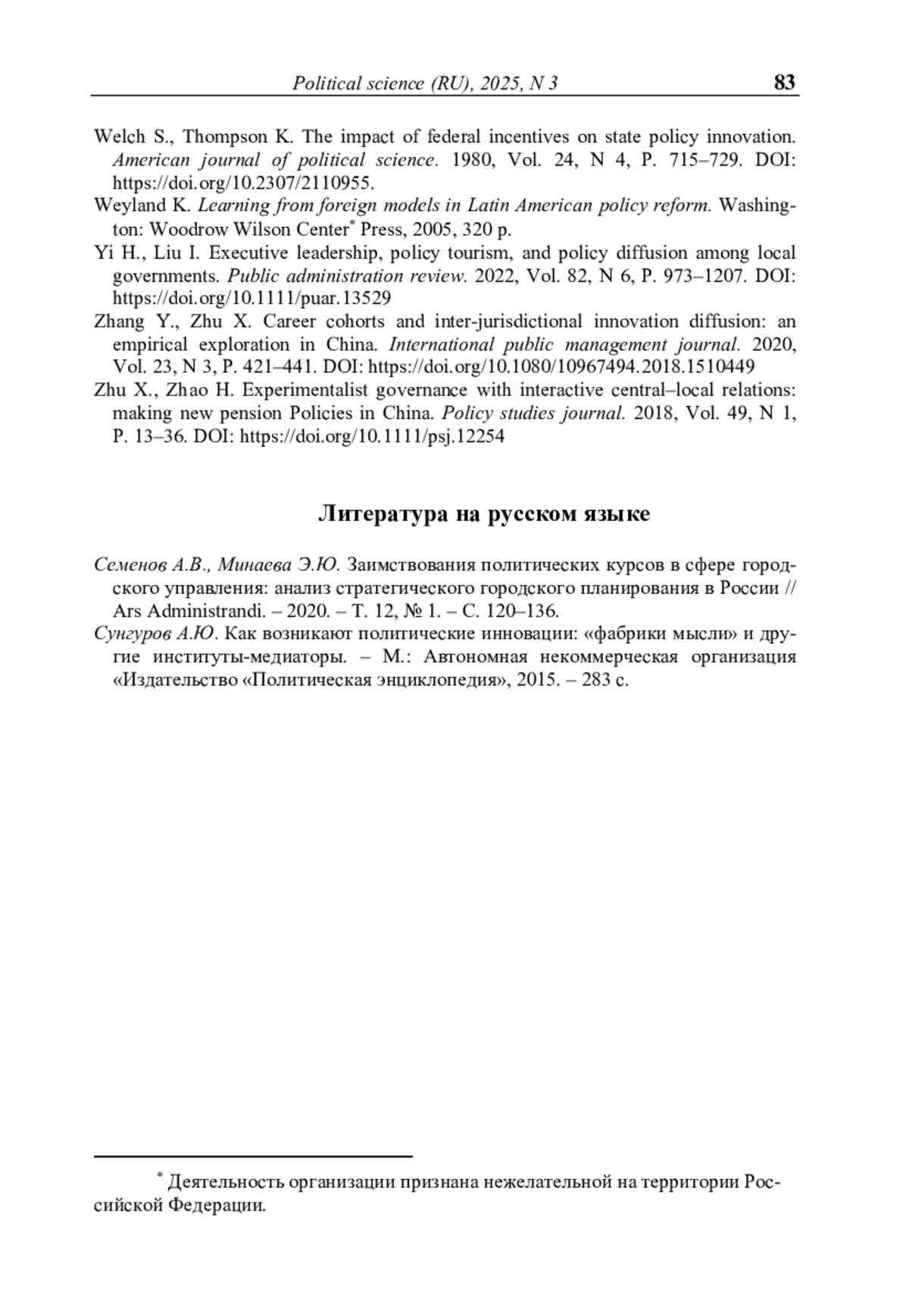 Данная статья представляет собой систематический аналитический обзор исследований, посвященных анализу моделей распространения политических инноваций в многоуровневых политических системах и основных механизмов распространения политики между иерархическими юрисдикциями. Особое внимание уделяется изменению эффектов распространения политических инноваций в контексте трансформации современного поля политической науки и переключению внимания исследователей к системам многоуровневого управления с участием нетрадиционных акторов (multilevel governance). В работе представлен обзор двух основных подходов к теоретической концептуализации процесса распространения политических инноваций – диффузии политики (policy diffusion) и политического трансфера (policy transfer). В первой части исследования рассматривается эволюция указанных теоретических моделей и соответствующих им основных механизмов диффузии. Во второй части исследования определяются ключевые детерминанты диффузии политики – структурные, институциональные и агентские характеристики, дается описание основных каузальных механизмов данных детерминант. Особое внимание уделяется феномену вертикальной диффузии (vertical diffusion) политических инноваций. Заключительная часть статьи посвящена сравнению моделей диффузии политики в западном и незападном политических контекстах на примере сравнительного анализа распространения политических инноваций в многоуровневых политических системах Китая и США.
