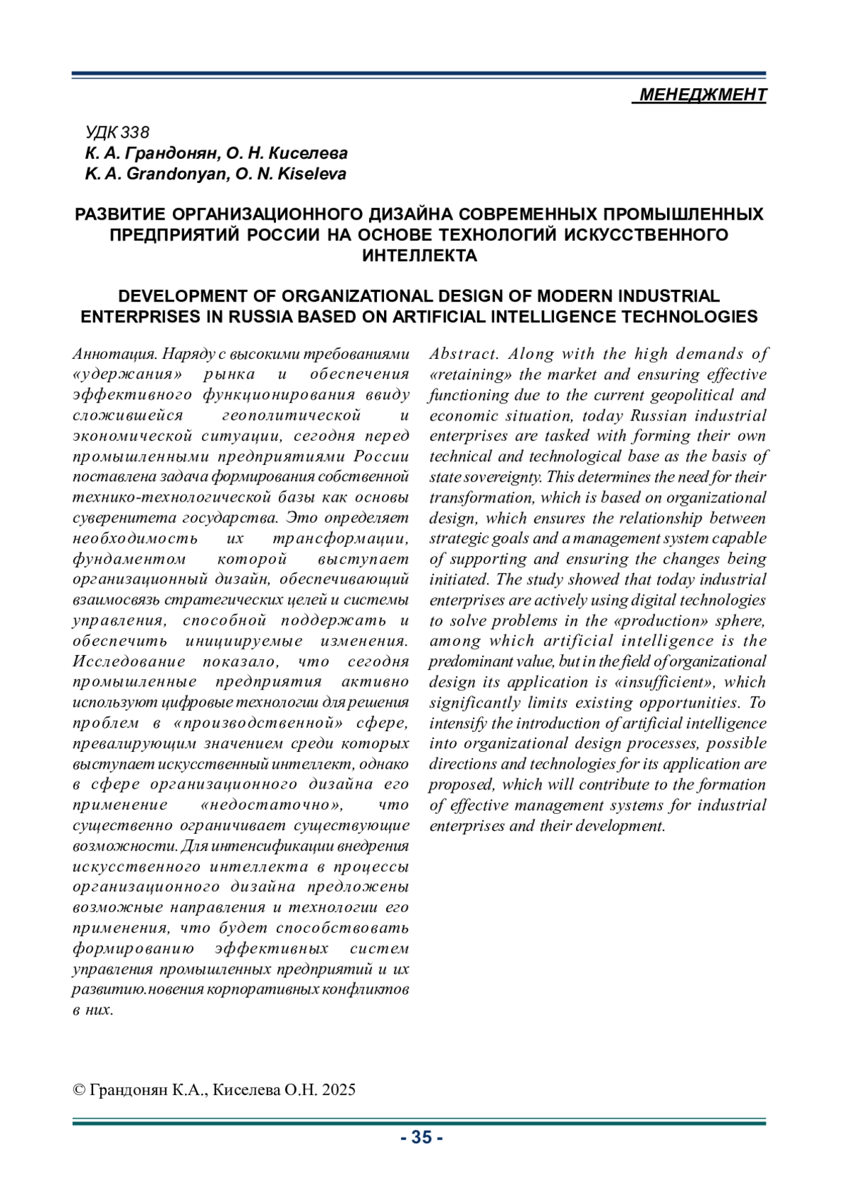 ГРАНДОНЯН К. А., КИСЕЛЕВА О. Н. РАЗВИТИЕ ОРГАНИЗАЦИОННОГО ДИЗАЙНА СОВРЕМЕННЫХ ПРОМЫШЛЕННЫХ ПРЕДПРИЯТИЙ РОССИИ НА ОСНОВЕ ТЕХНОЛОГИЙ ИСКУССТВЕННОГО ИНТЕЛЛЕКТА // ИННОВАЦИОННАЯ ДЕЯТЕЛЬНОСТЬ. 2025. № 2 (73)